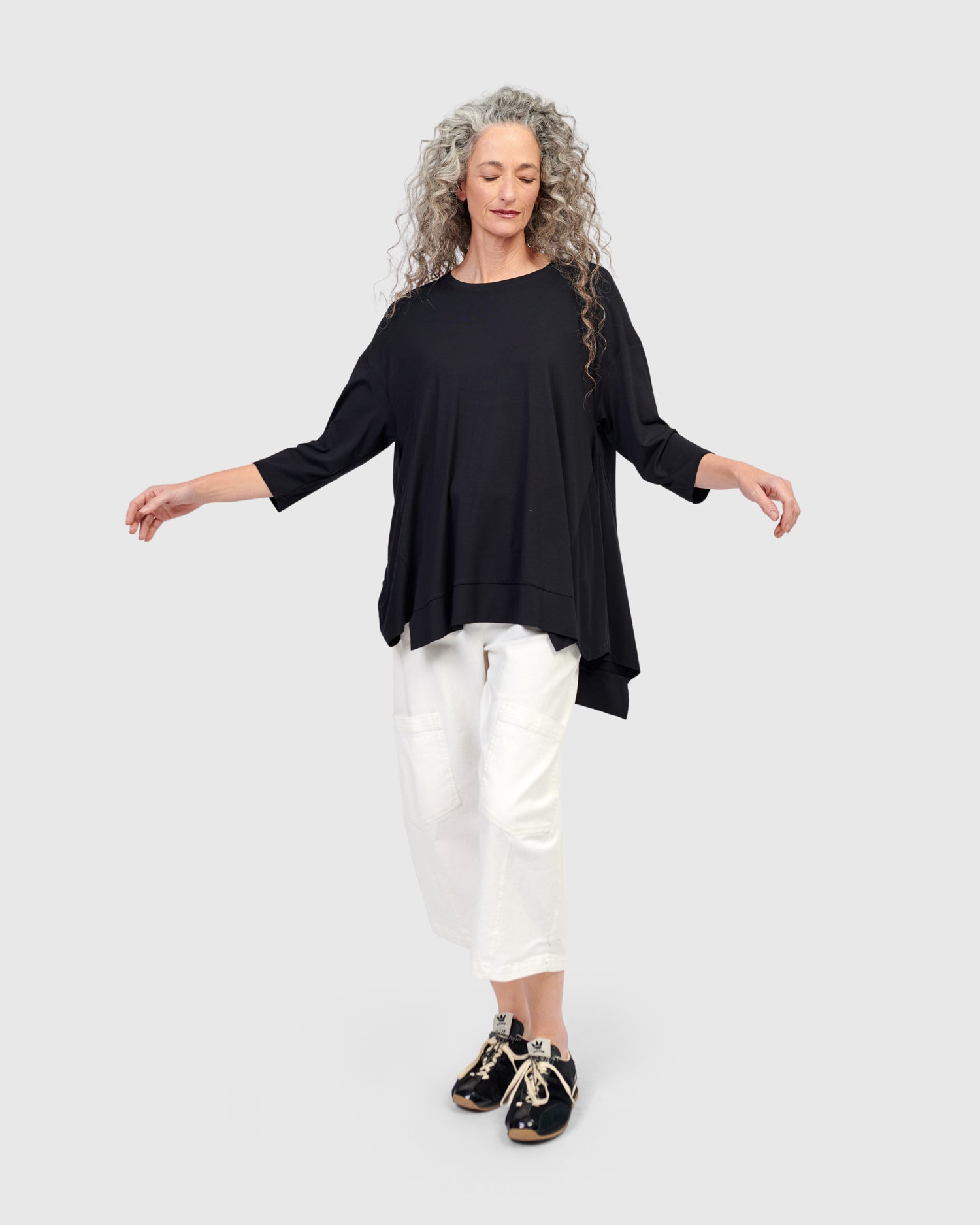 Swing and softness. Our generously cut trapeze top has become an best-seller for it's gorgeous shape and drape on every figure. The swingy silhouette in jersey knit features a notched hi-lo hem with clever bias-cut inset sides. Pullover with round neck, three-quarter sleeves.