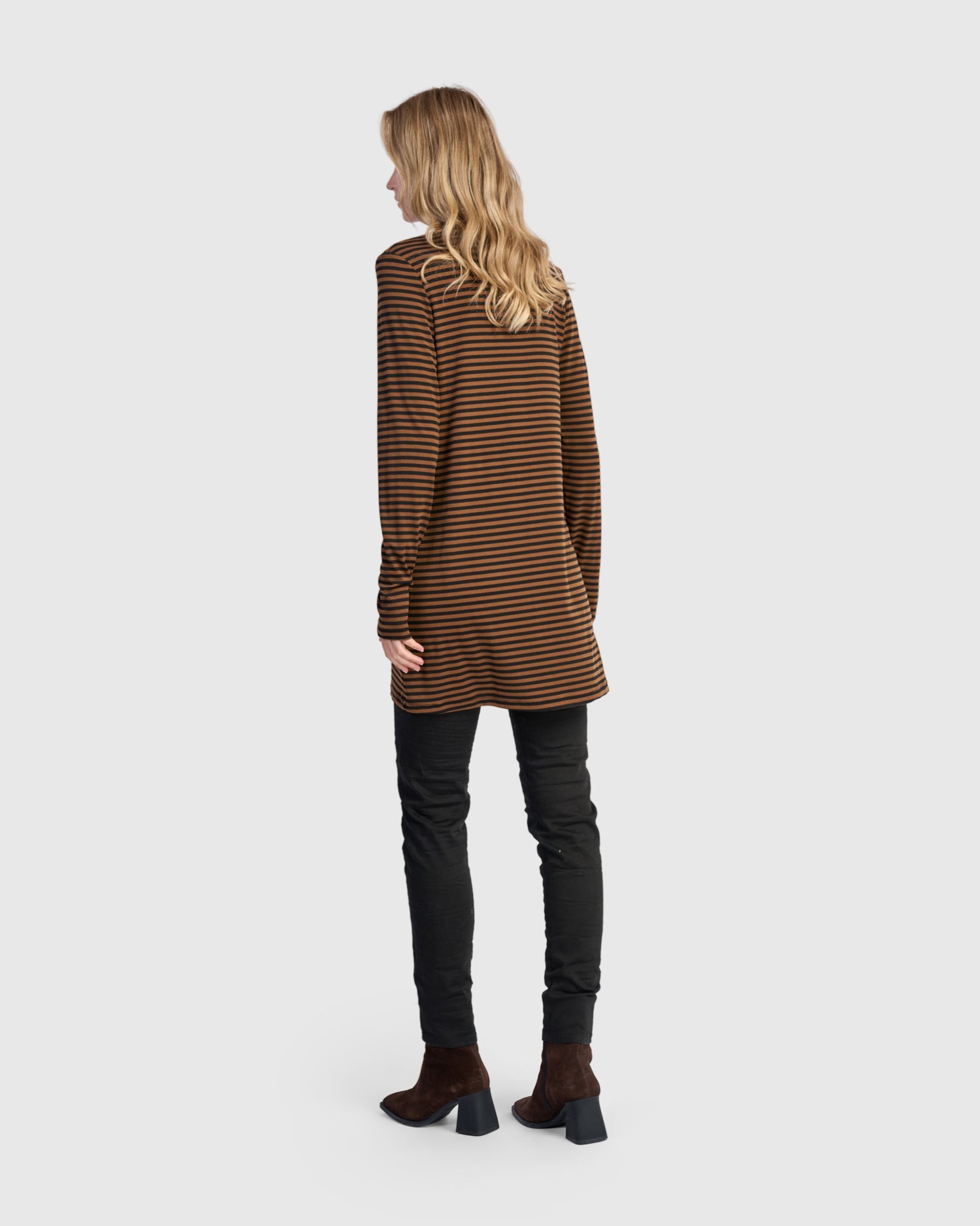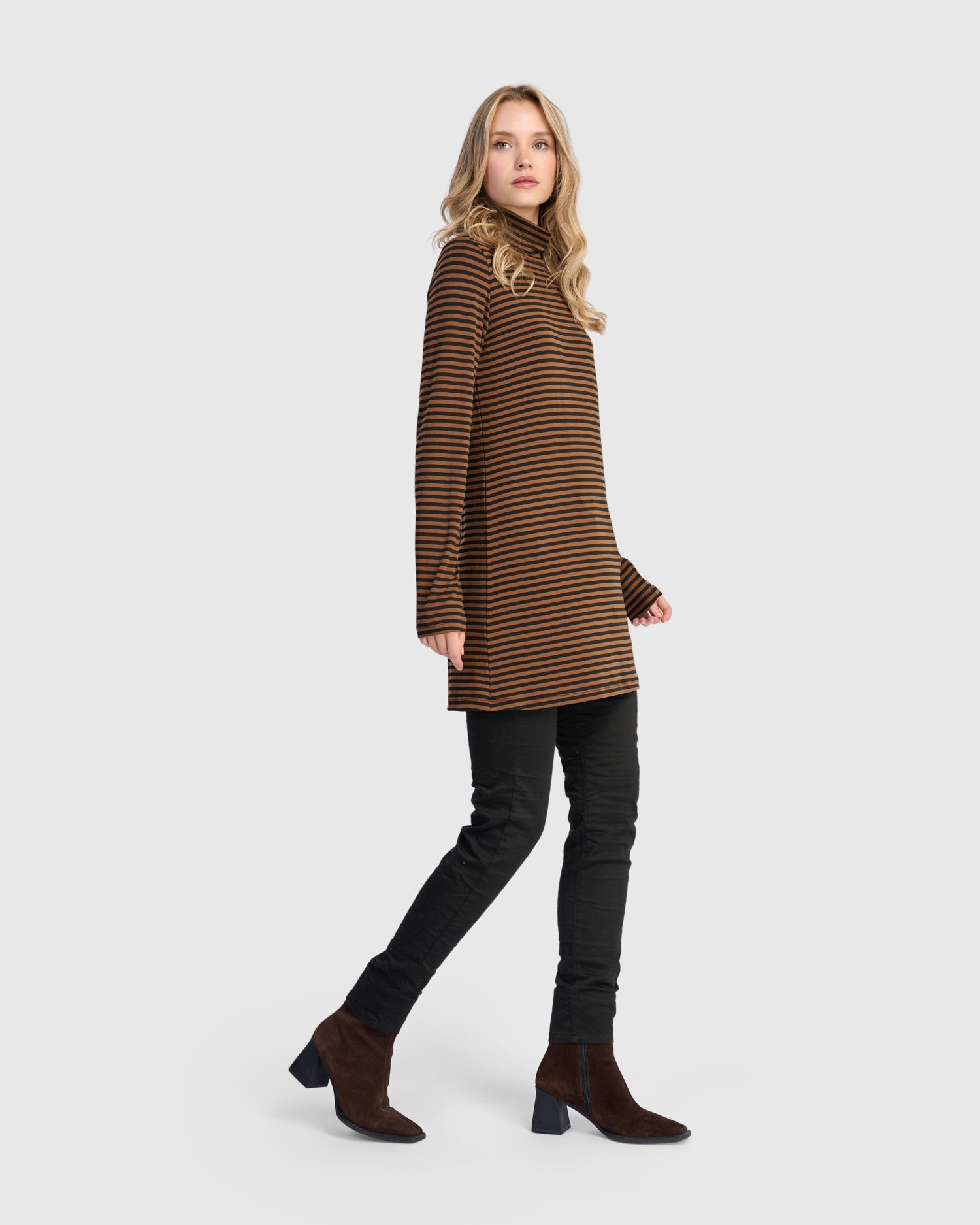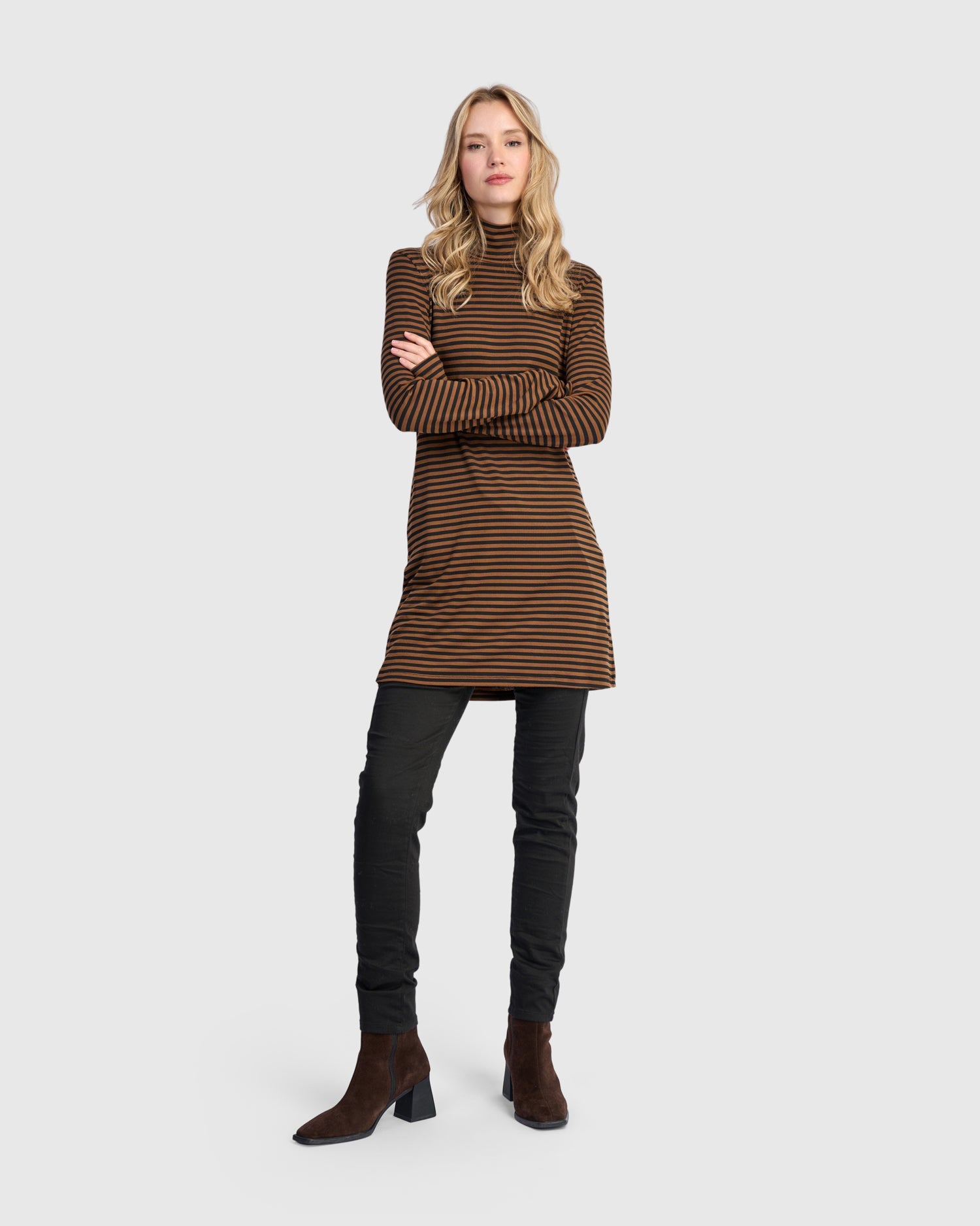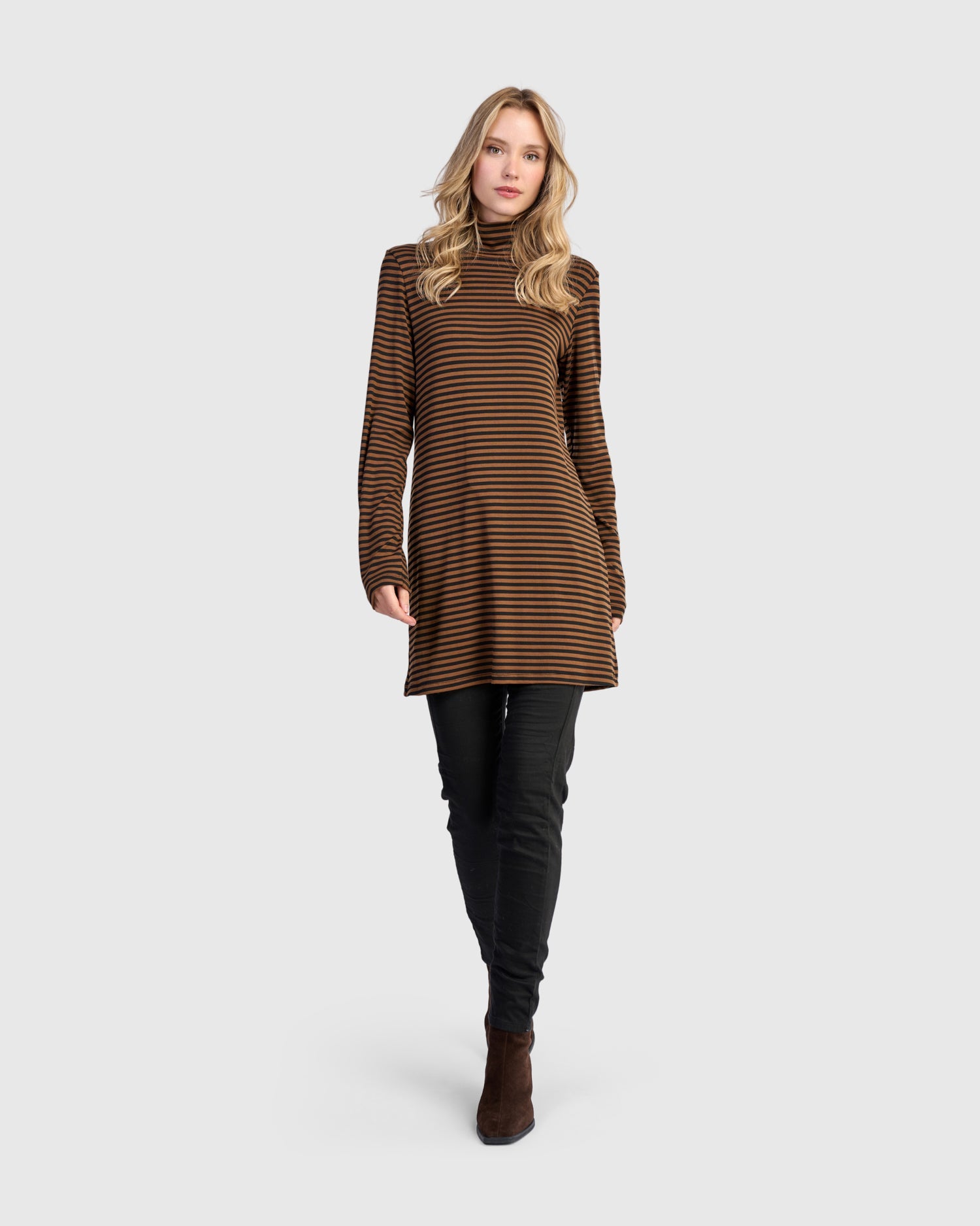A versatile essential with subtle texture, this tunic-length turtleneck is cut for a relaxed yet polished silhouette. The foldover collar and extra-long sleeves provide cozy coverage, while soft viscose jersey lends stretch and drape. Its understated stripes make it ideal for layering or wearing solo as a minimalist statement.