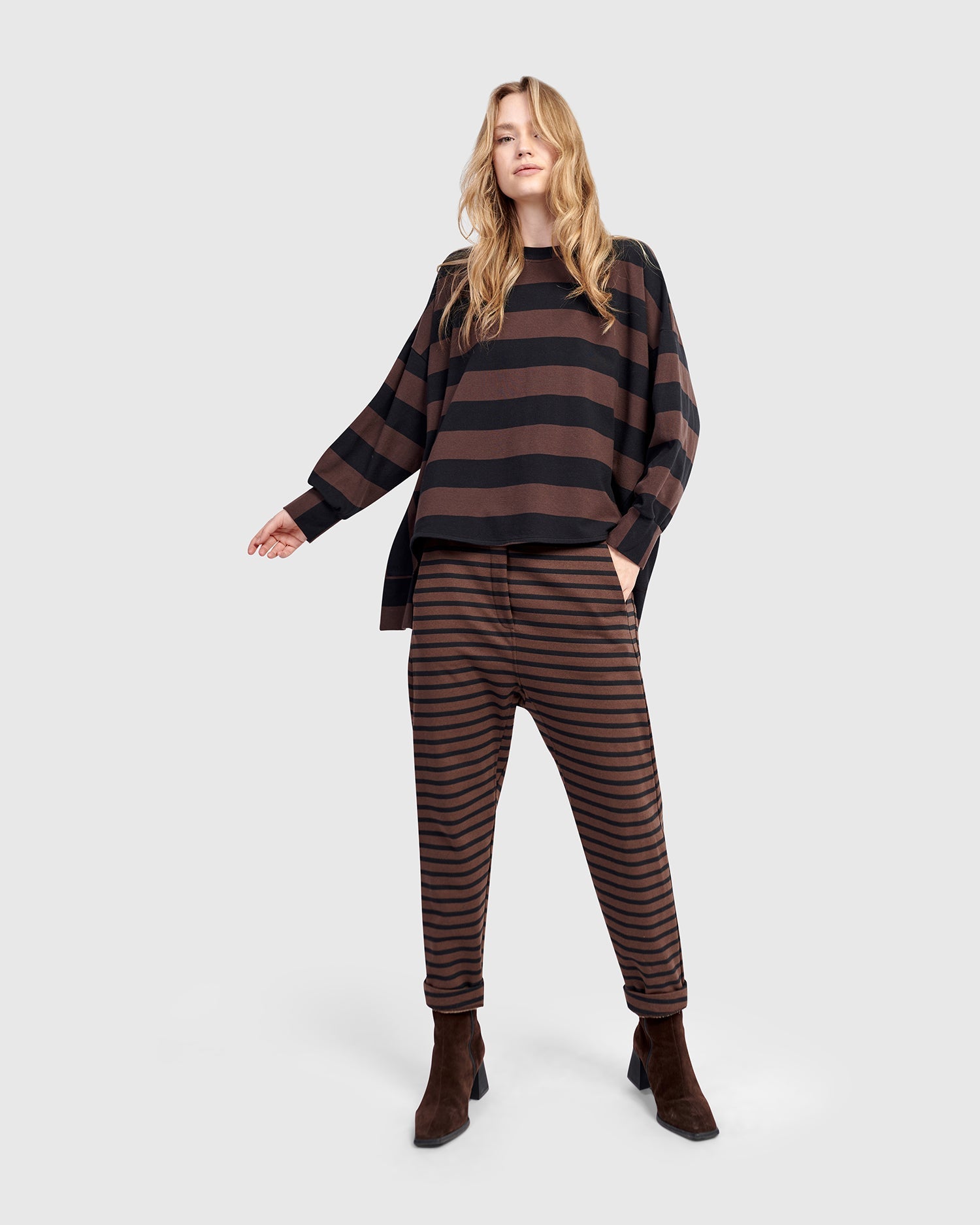 A relaxed take on an everyday favorite, this oversized tunic tee offers a boxy, curved silhouette with a modern hi-lo hem. Made from breathable stretch cotton jersey, it balances softness with structure. Dropped shoulders and loose sleeves with a cuff finish lend casual refinement. Ideal for layering or wearing solo as a directional staple.