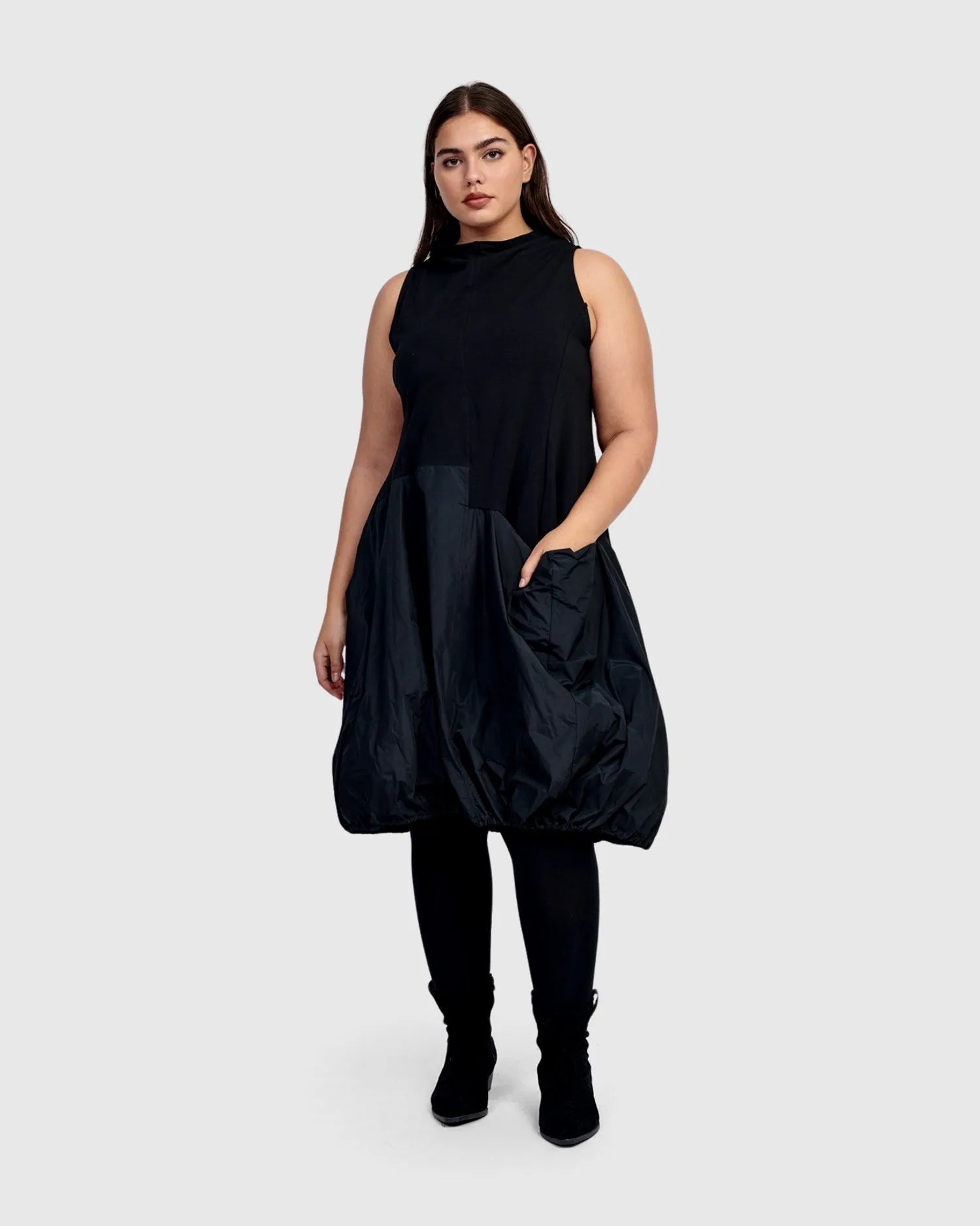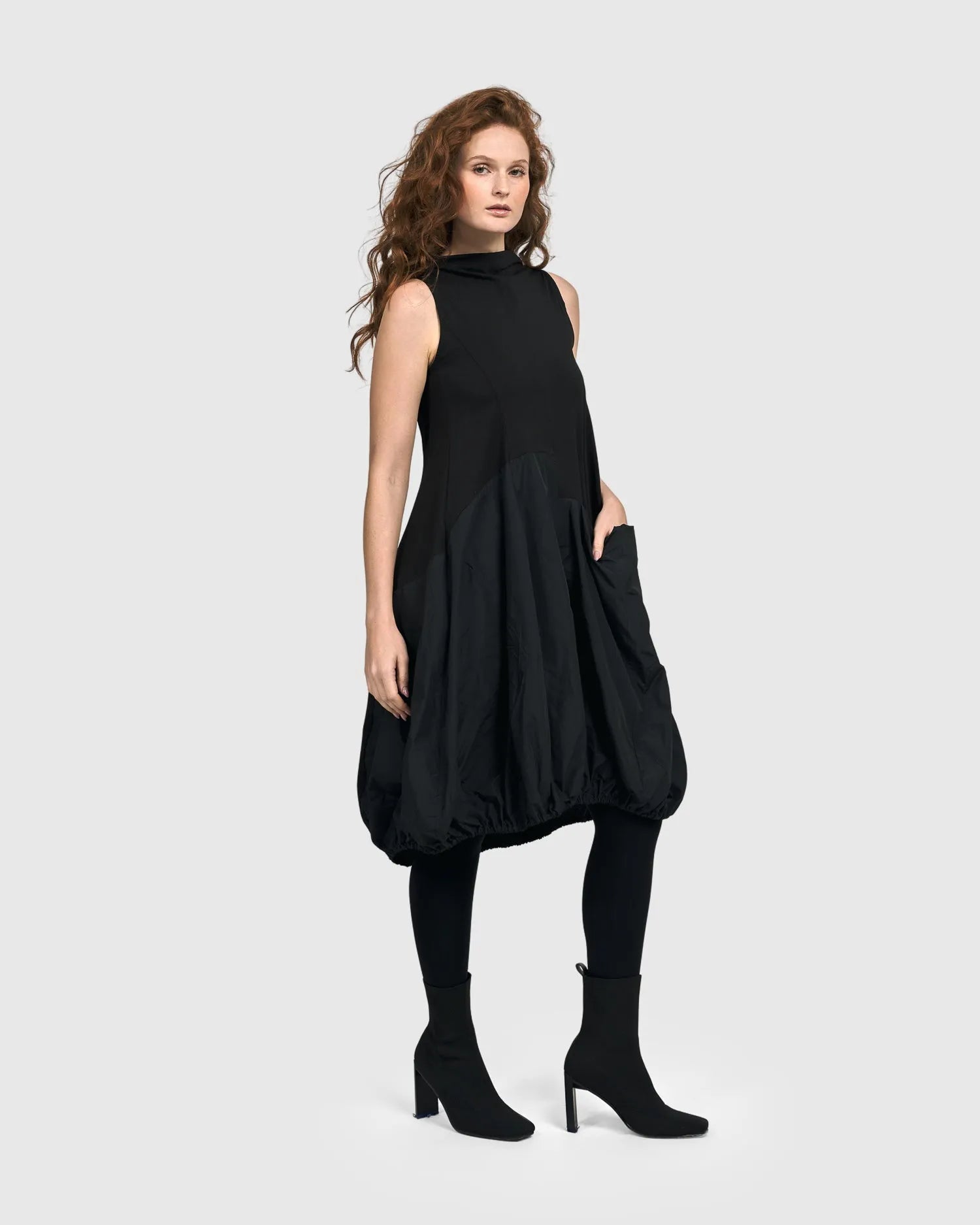 This elegant sleeveless dress has a boat neck and stretch jersey knit bust with balloon skirting in a crisp taffeta fabric. The draped pocket and gathered hem are a signature touch, creating a dynamic dress perfect for dressing up or down and layering over or under.