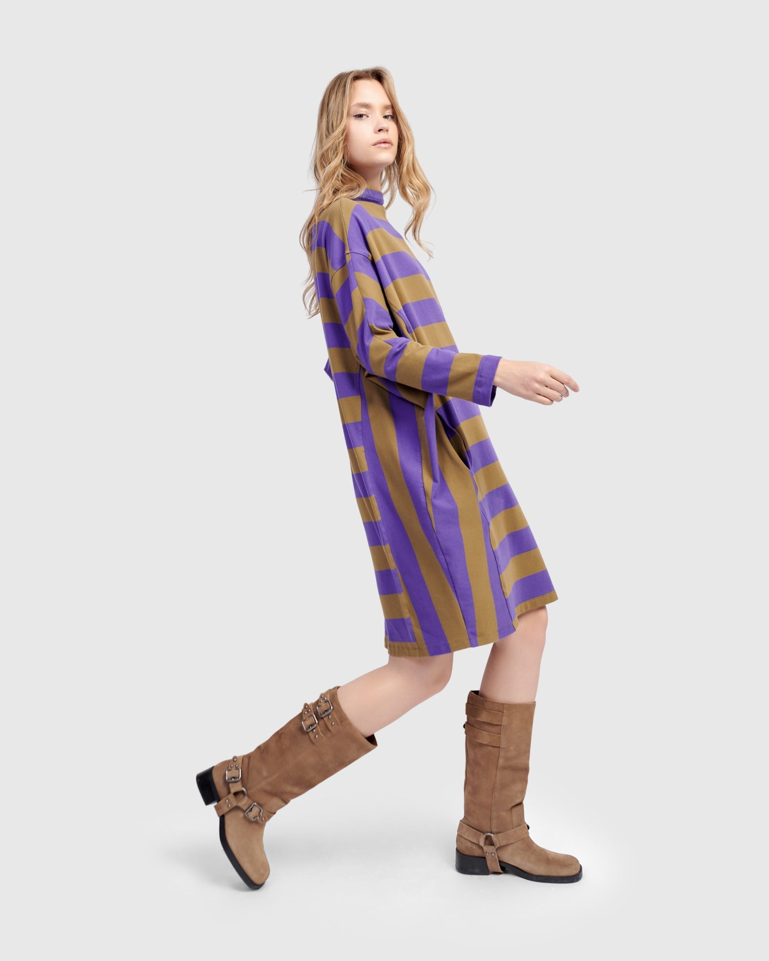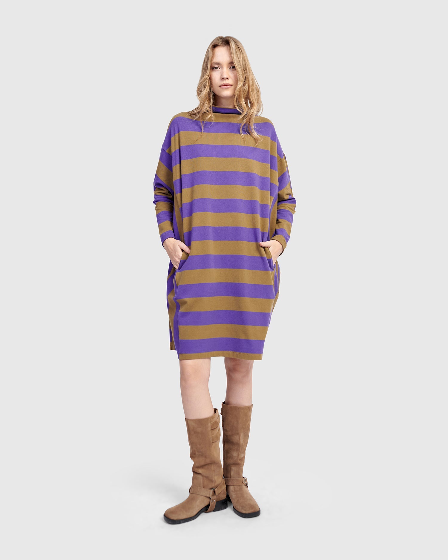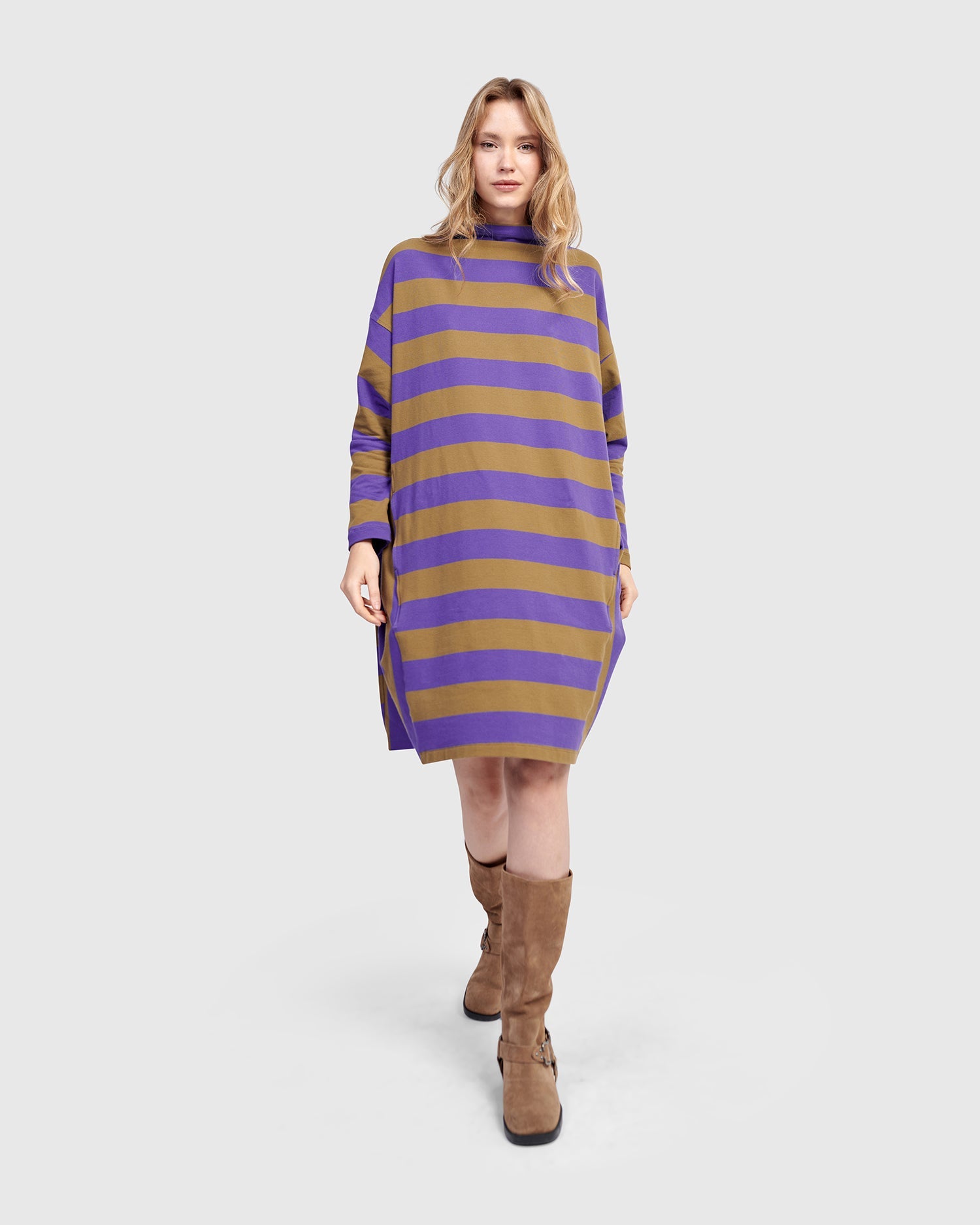Bold and sporty, this tee dress features a tapered shape and contrast stripe detail for dynamic appeal. Made in a substantial cotton knit with a structured funnel neck, it offers comfort with a strong silhouette and a hint of streetwear flair.