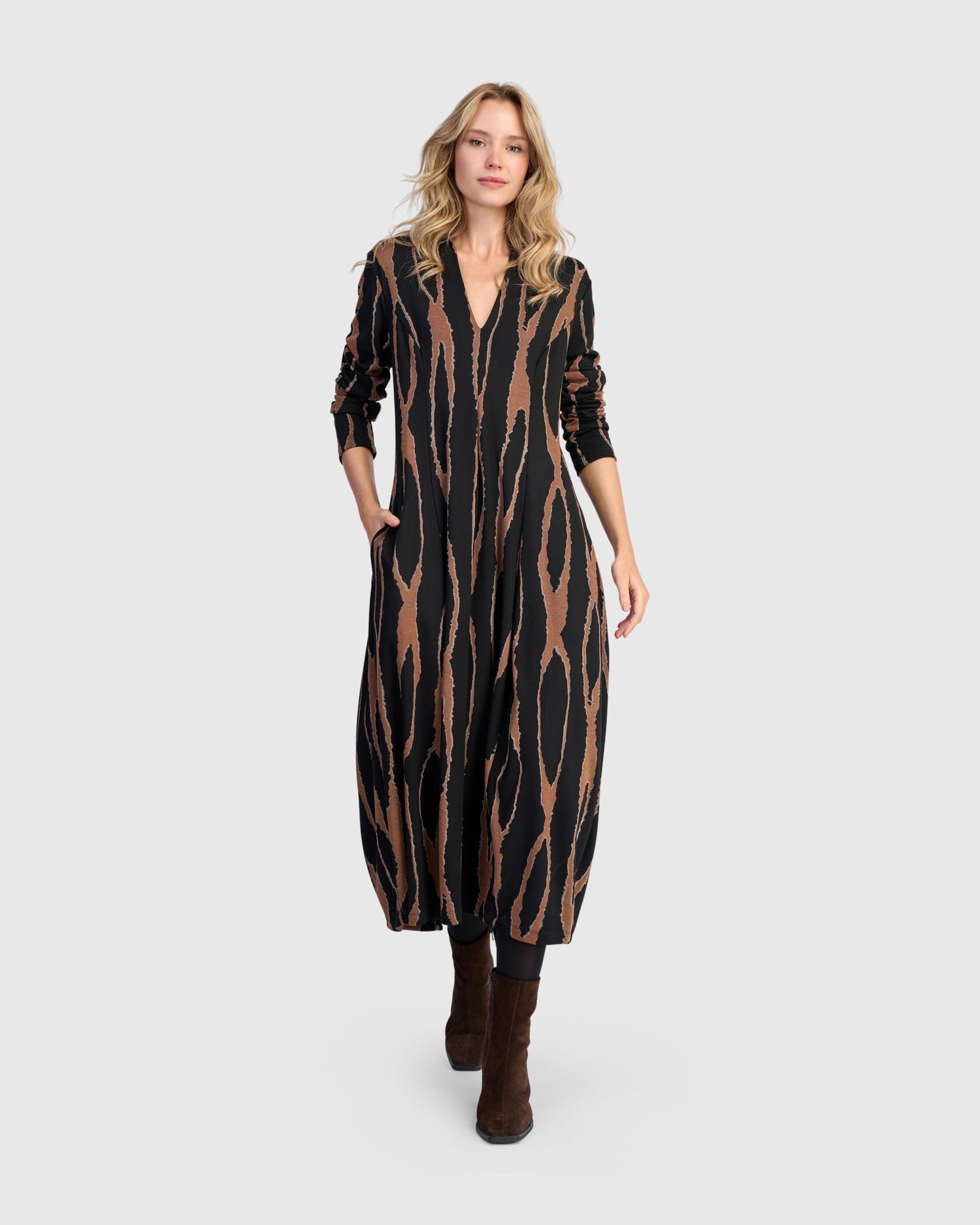 Crafted in a plush heavyweight jersey, this cocoon dress delivers cozy structure and modern shape. The tailored top flows into softly architectural skirting with a back slit for ease. A reinforced V-neck and inset seams add polish to the fluid, swingy form.