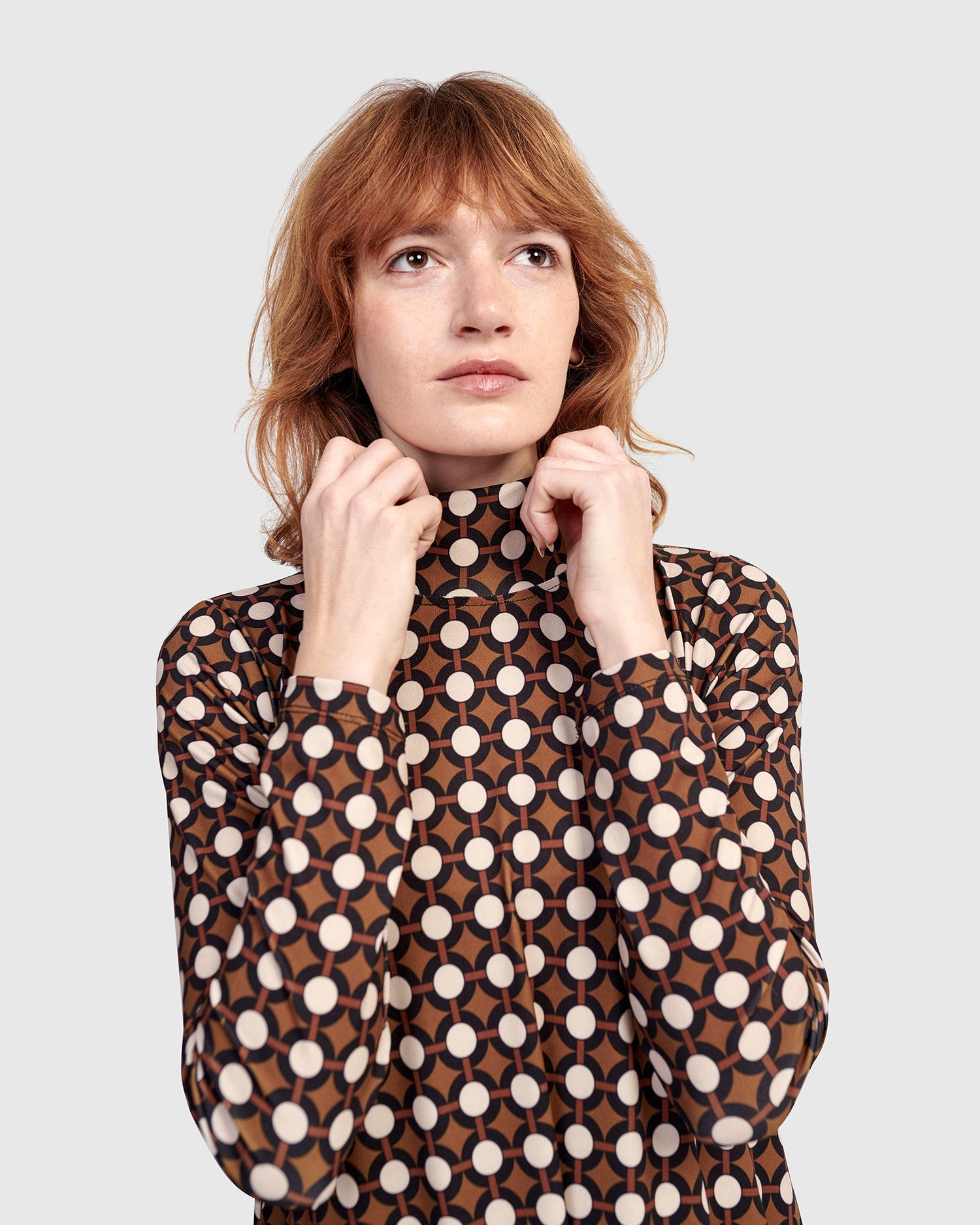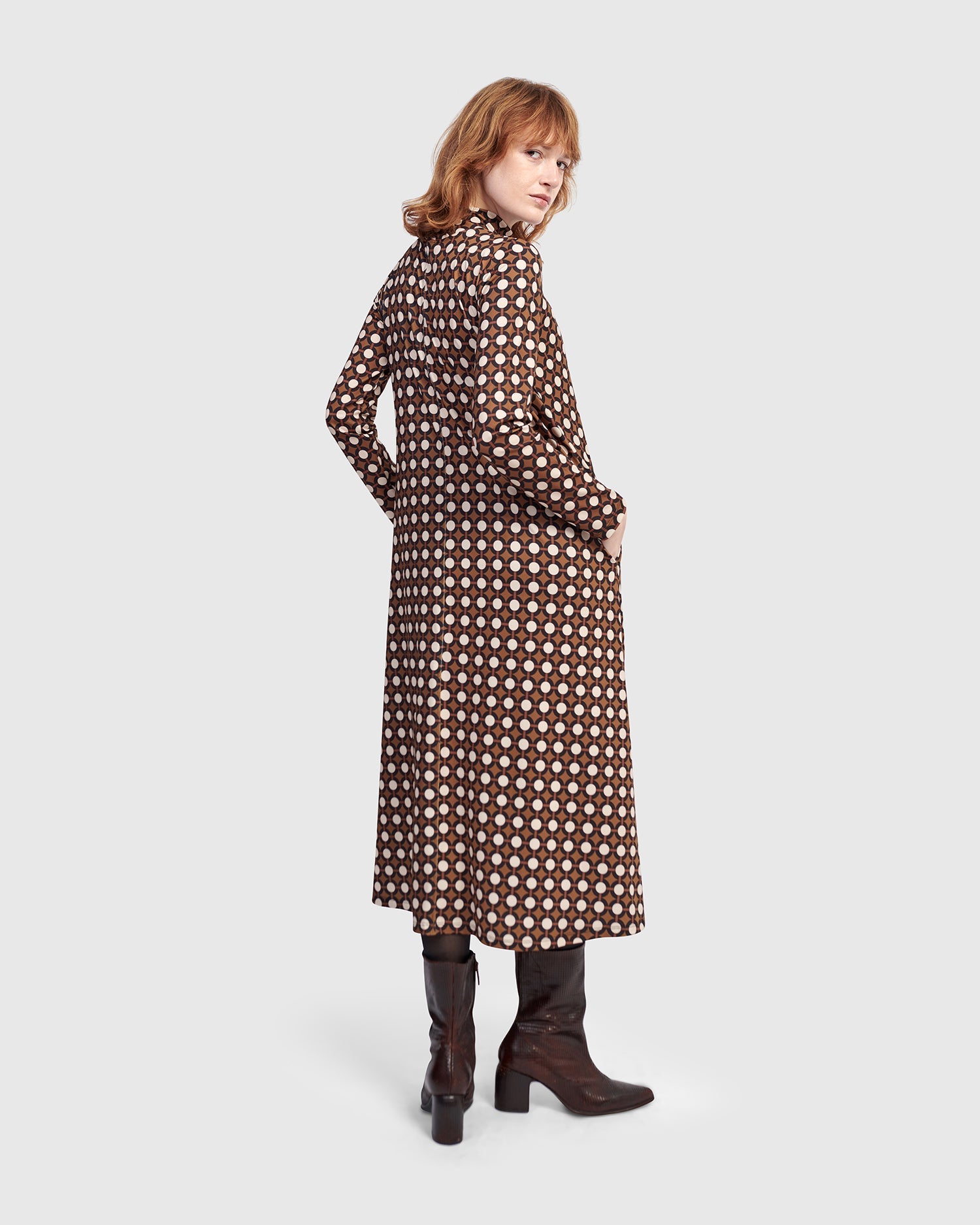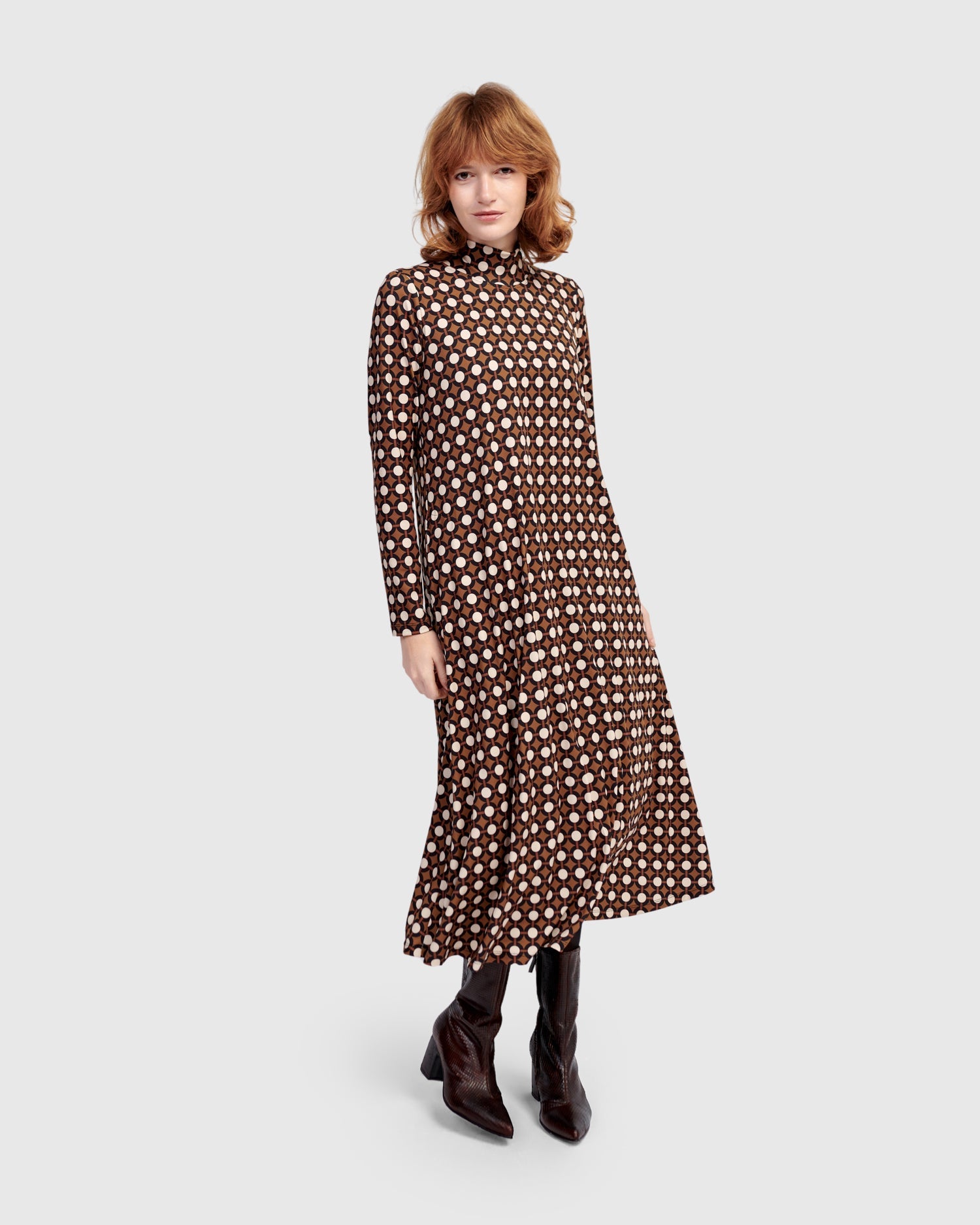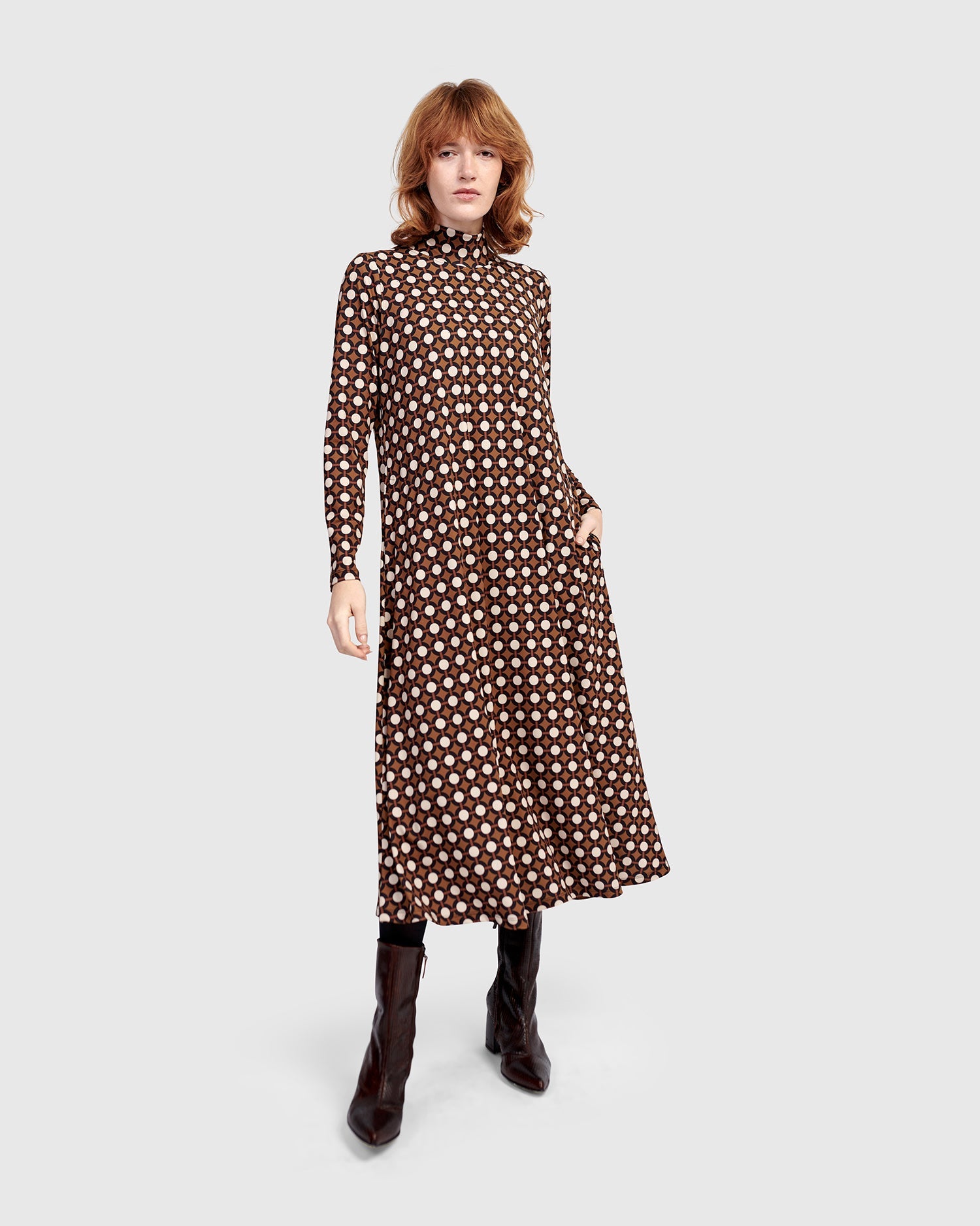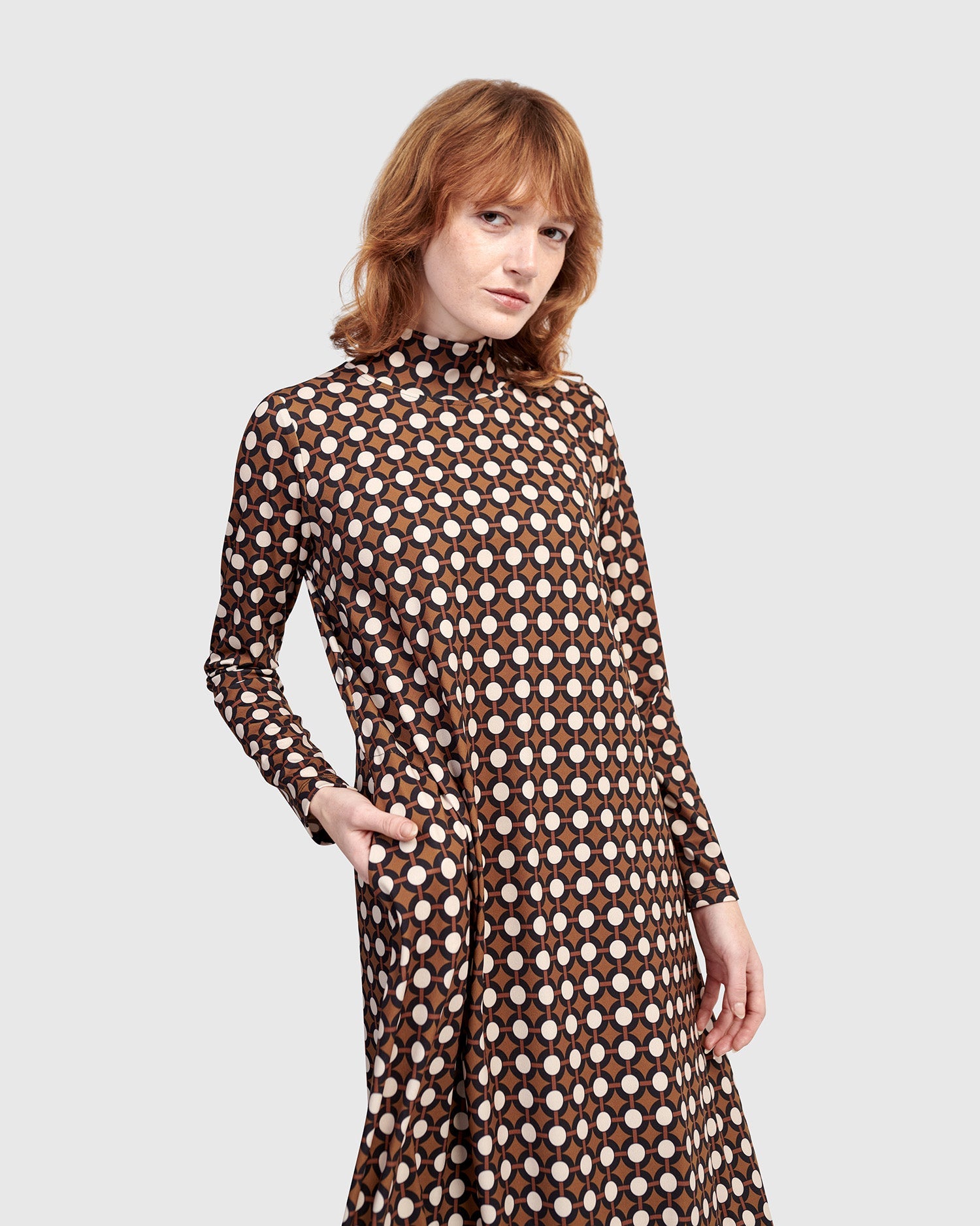 This A-line stunner flows effortlessly from slim shoulders into a fluid drape that flatters without clinging. Cut in a matte jersey with soft stretch, the dress moves with ease and maintains its shape. A mock neckline and set-in sleeves add structure, while functional side pockets underscore its everyday appeal.