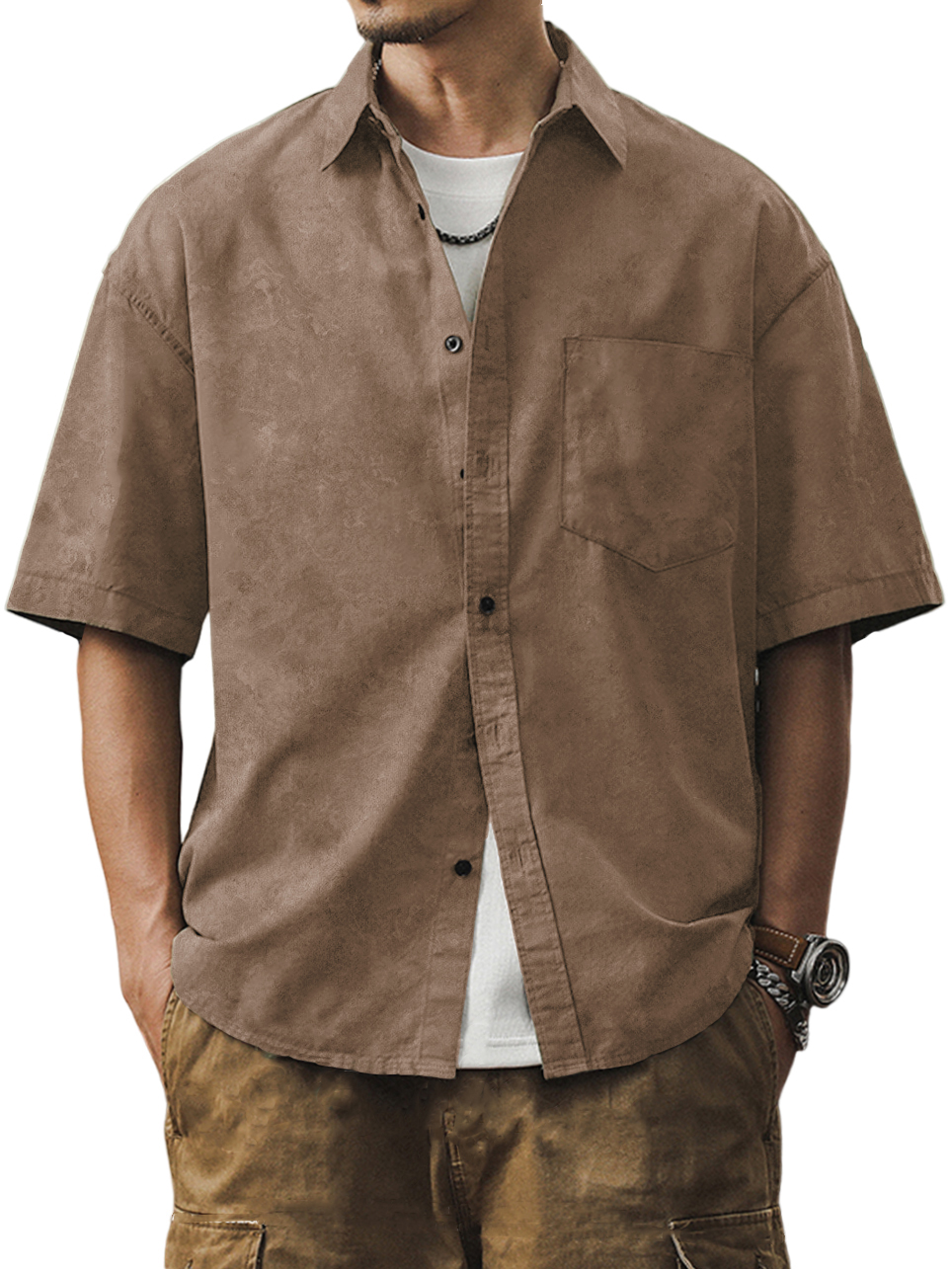 Men's Casual Distressed Printed Pocket Short Sleeve Shirt