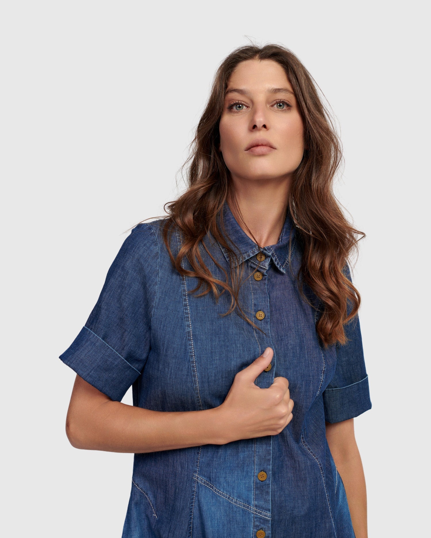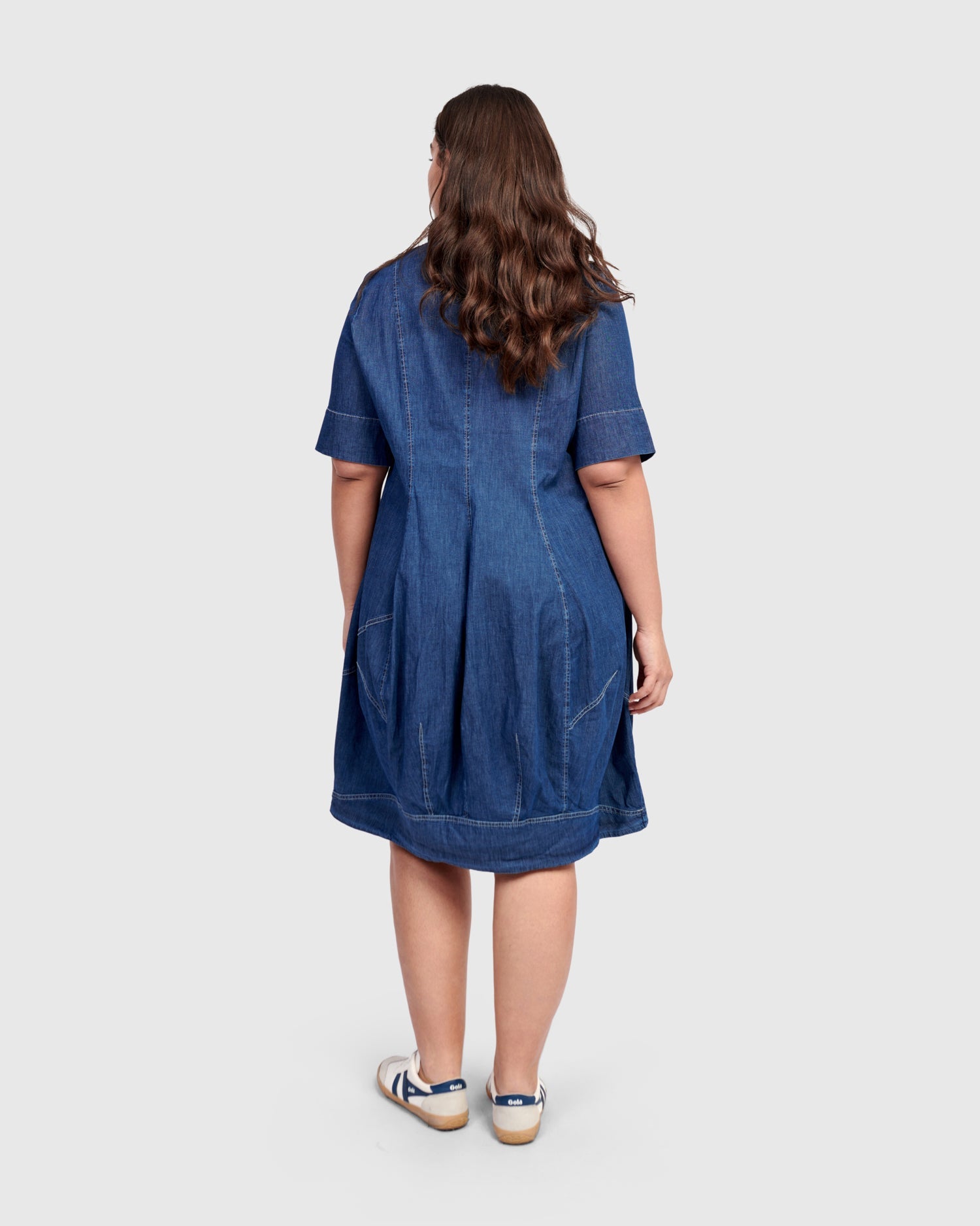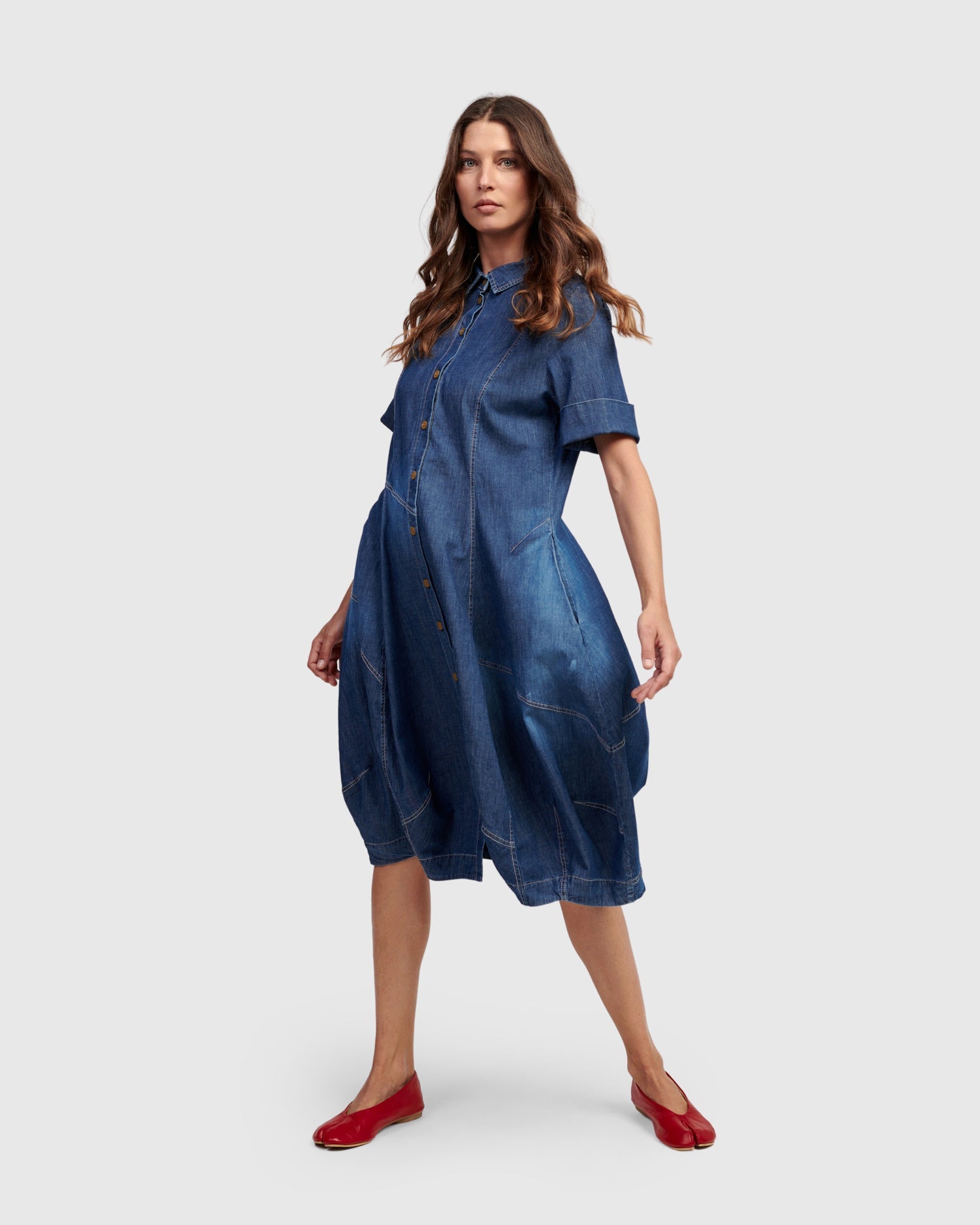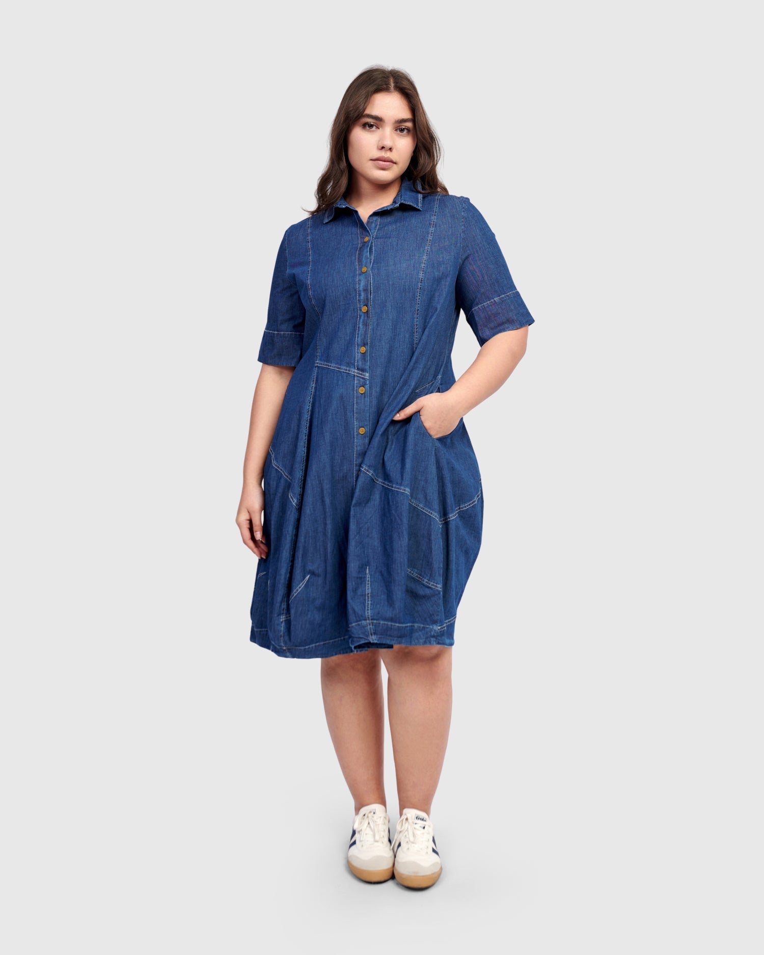 This casual version of the signature Wonderful Dress is made in a lightweight denim woven and has a foldover collar, full button placket, elbow length sleeves, and side pockets. A slim fit that flatters, with signature draping, denim seam detailing and pouf skirt to hold shape. Fitted at the bust.