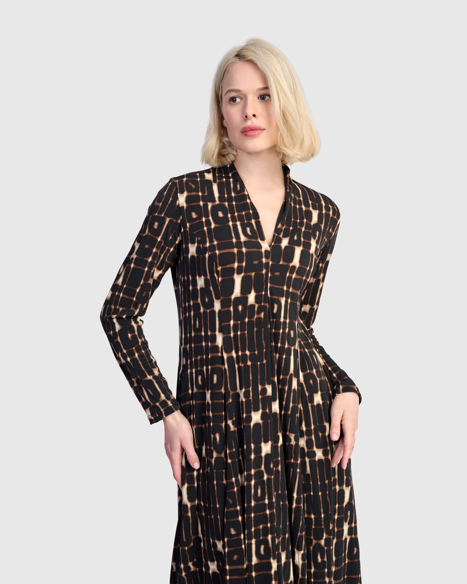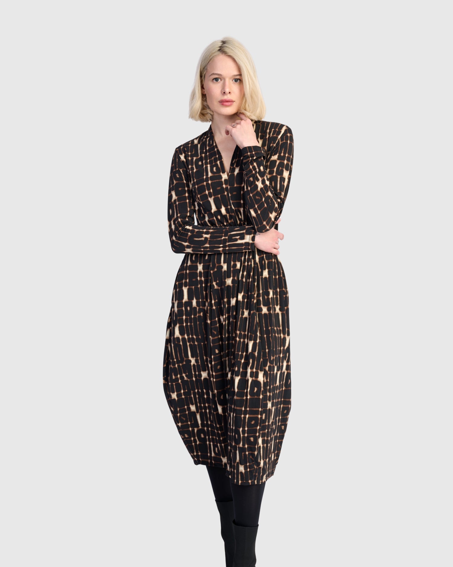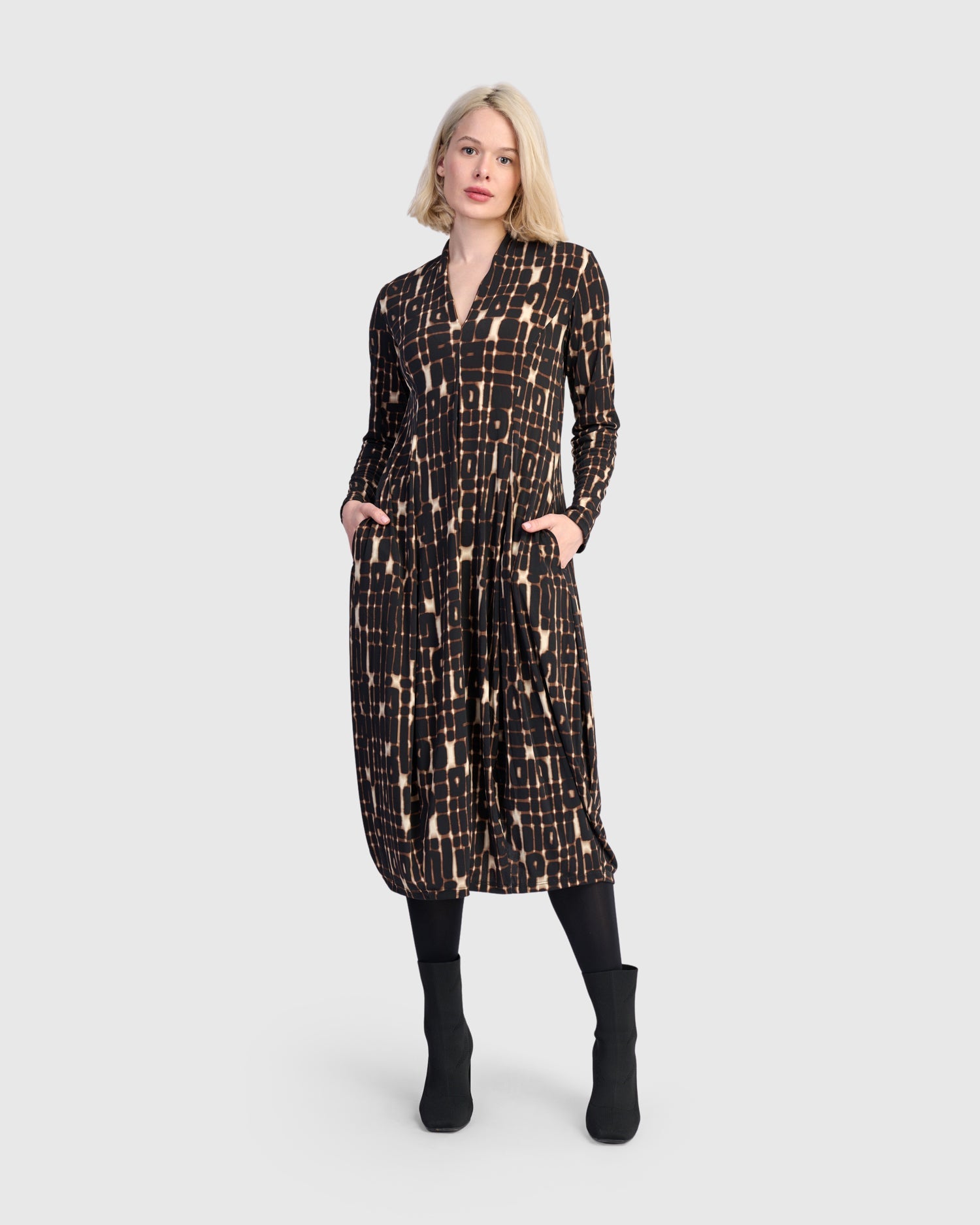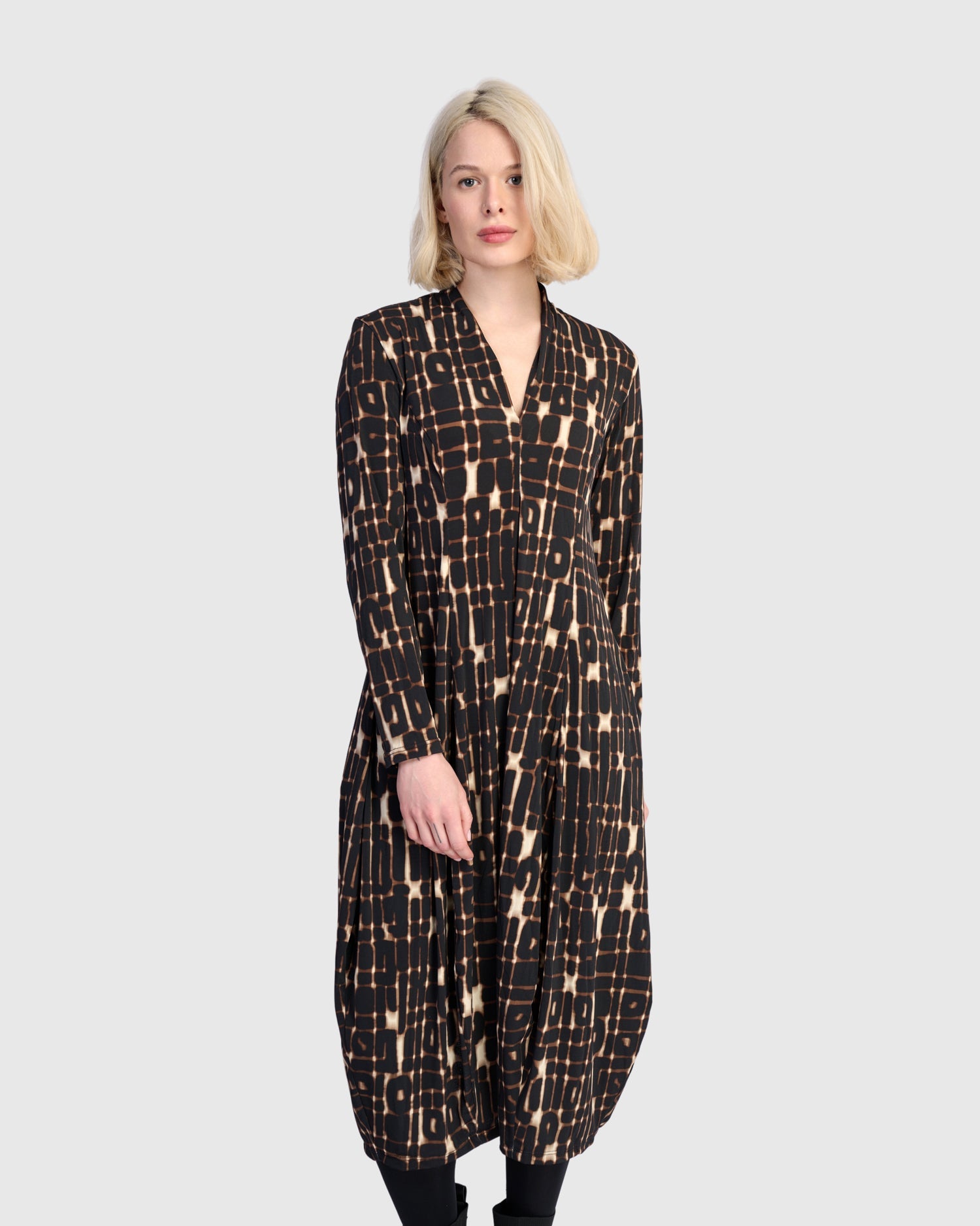 With its signature cocoon shape, this dress offers a sculptural silhouette that flatters while allowing for movement. The pieced construction adds subtle texture, while the stretchy knit fabric flows easily over the body. Finished with a deep V-neck and discreet back slit, it's both refined and relaxed.