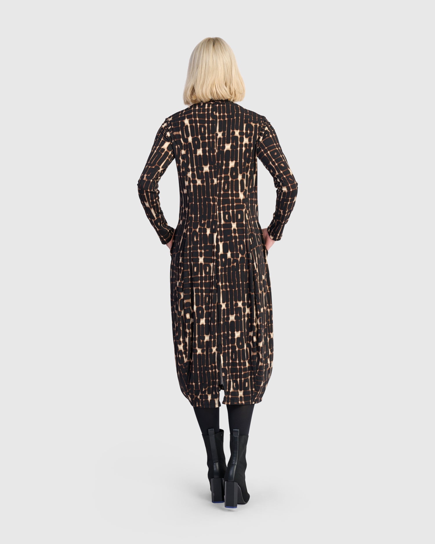 - Fitted in shoulders and bust, tapers out at waist into swingy skirting