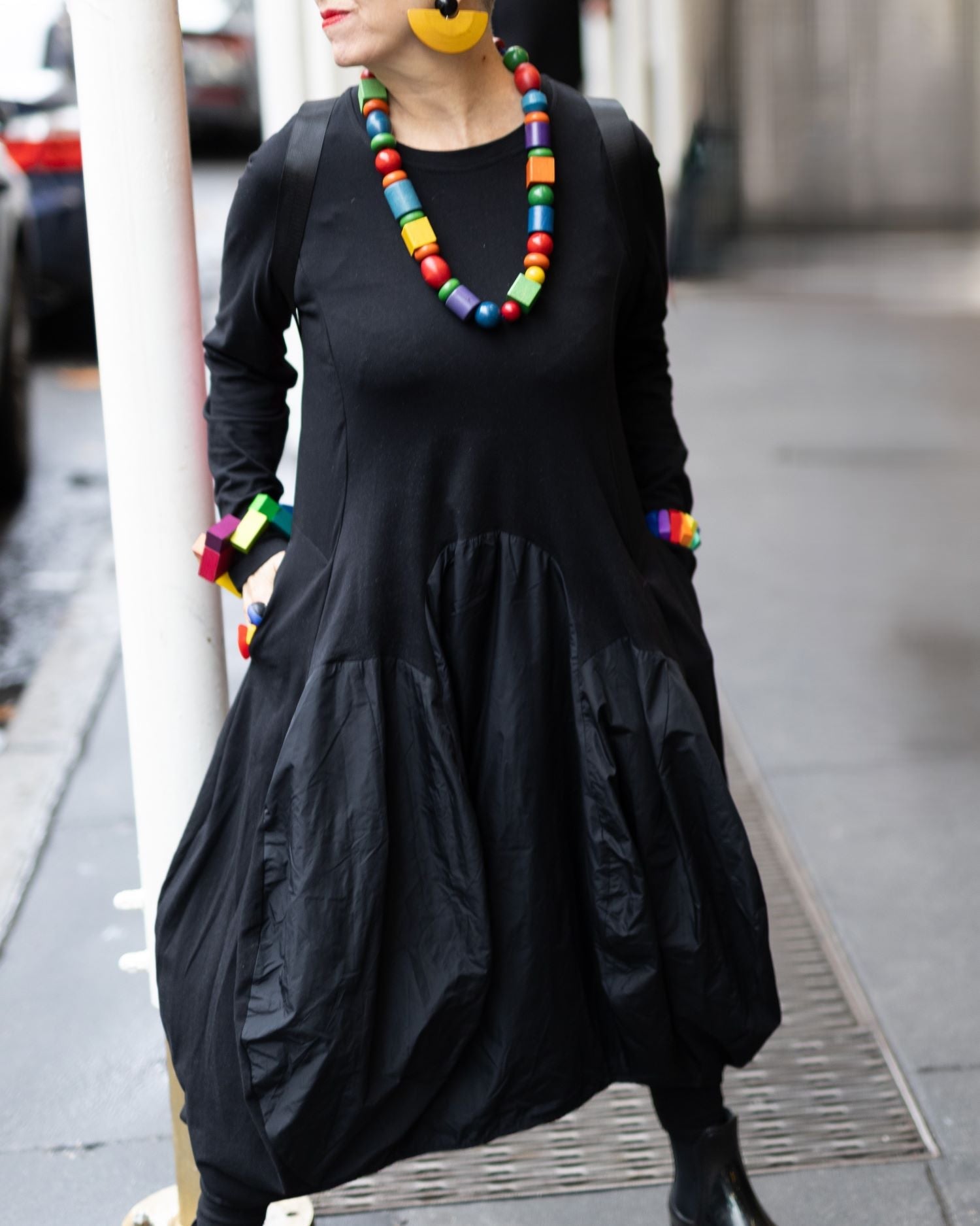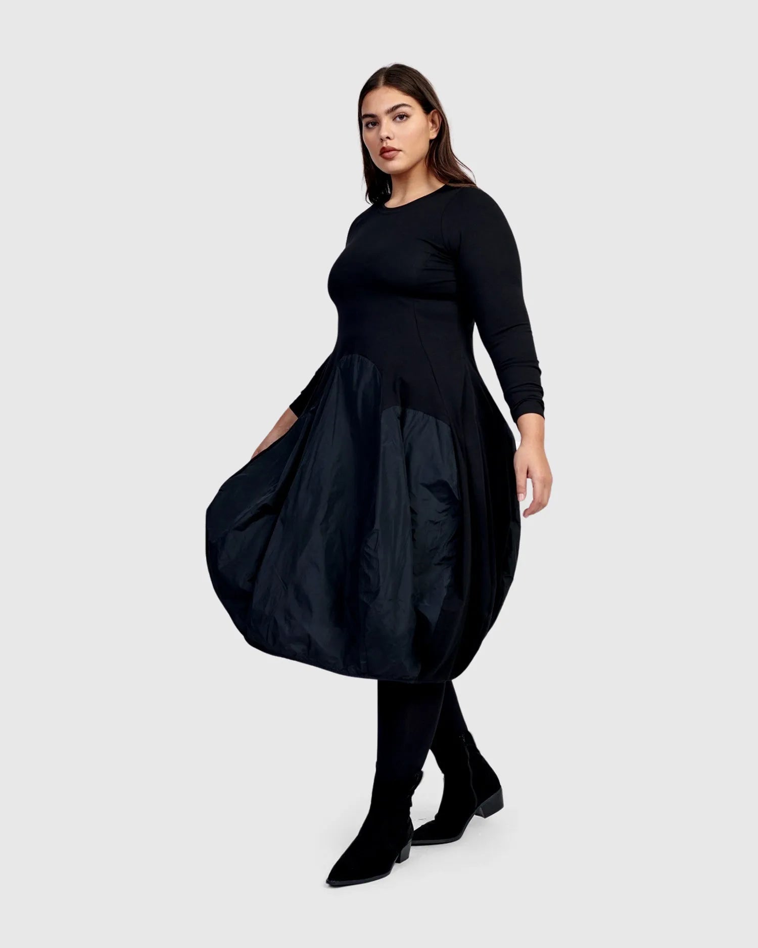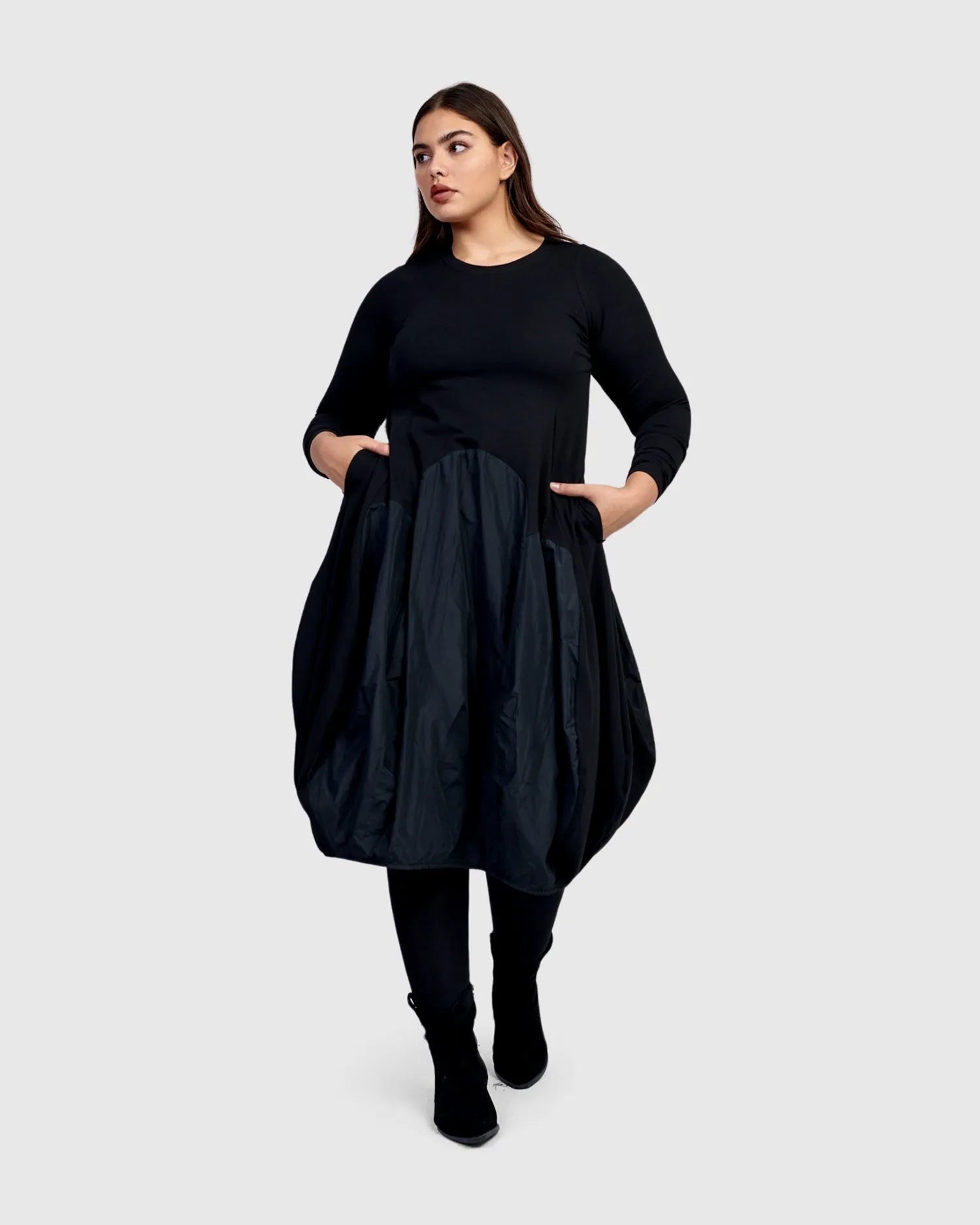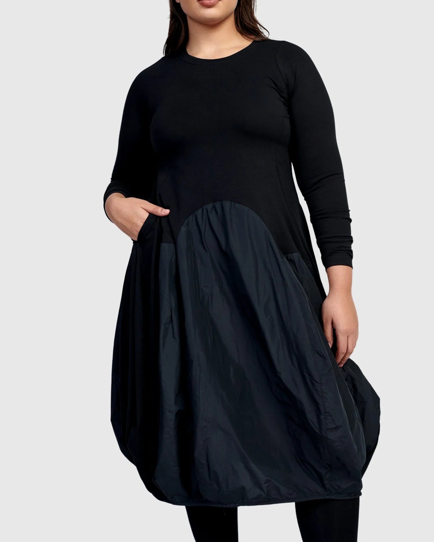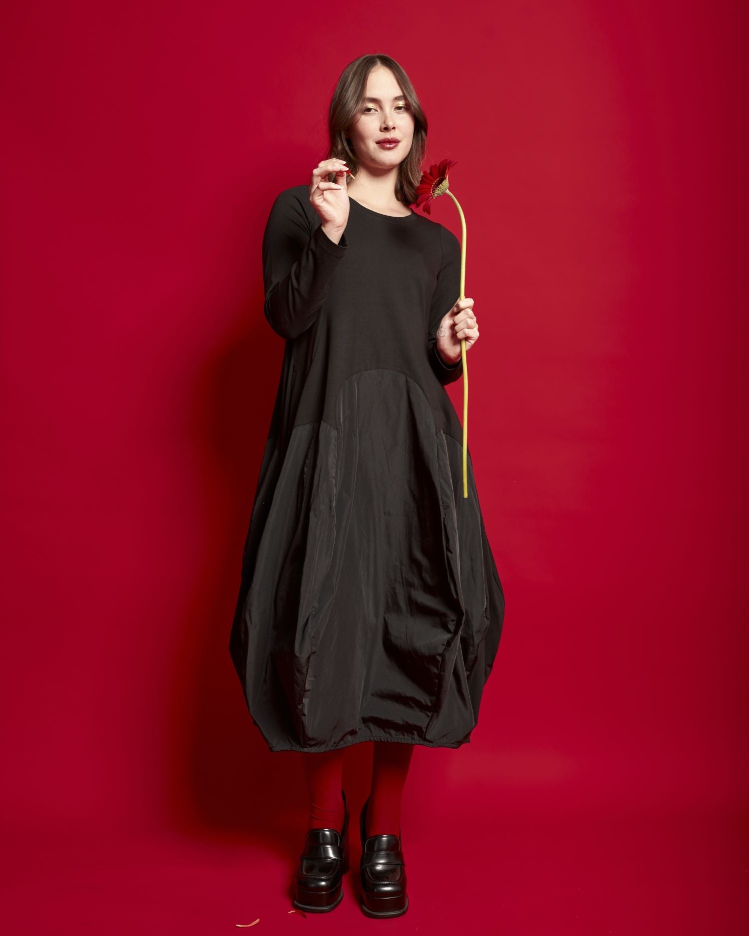 This casual cocoon dress is made in a soft and stretchy jersey knit in the arms and bust, then flares out into crisp memory fabric balloon skirting. The pullover style with long sleeves and in-seam side pockets falls just below the knees. This silhouette is a great choice for creating an architectural, edgy outfit, or if you just want to accentuate your shape.