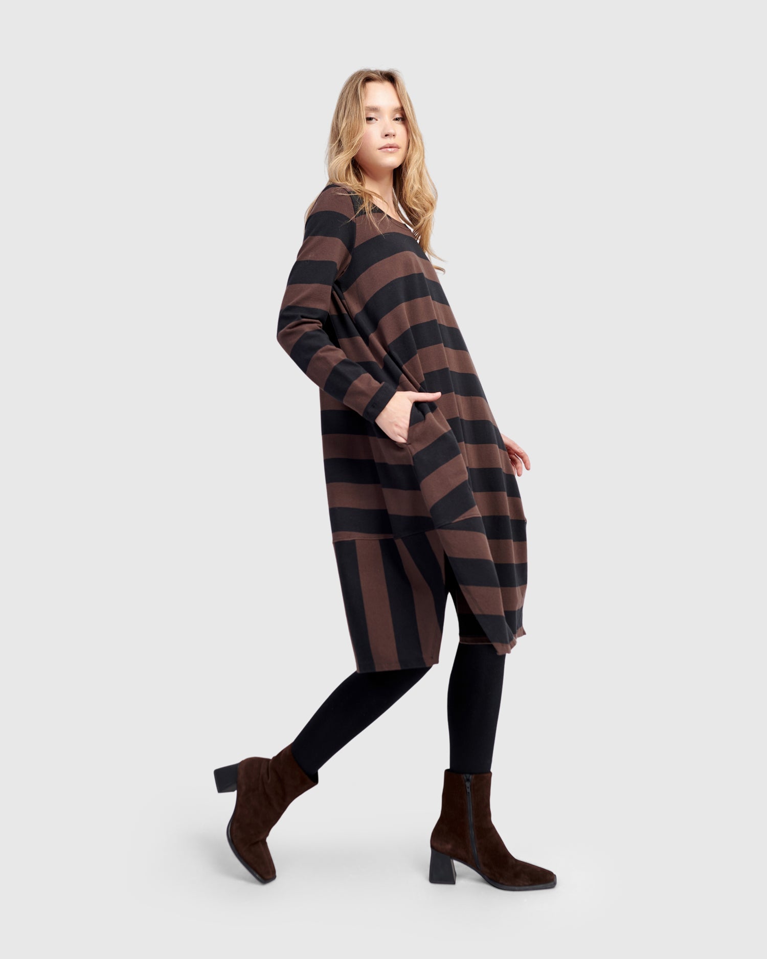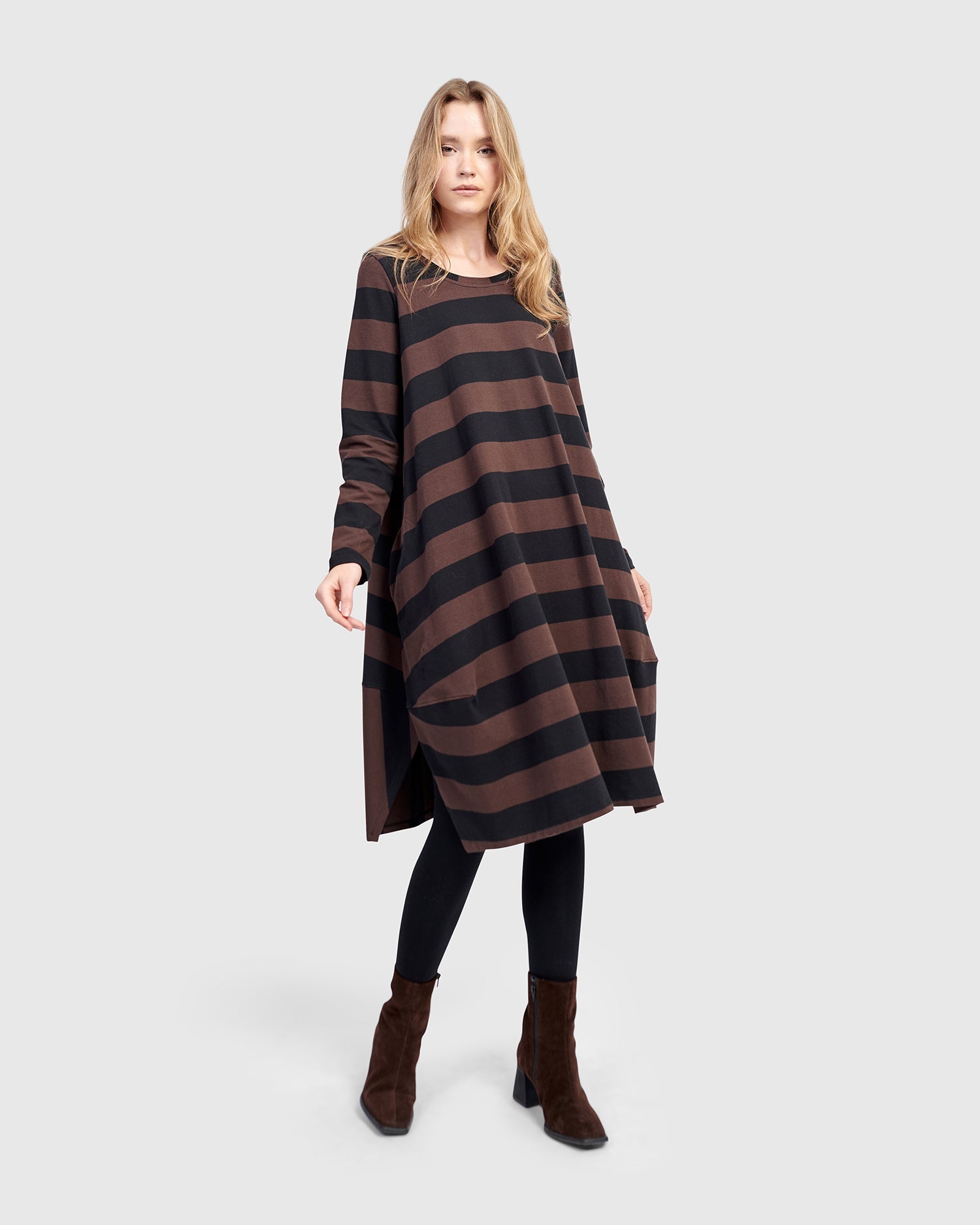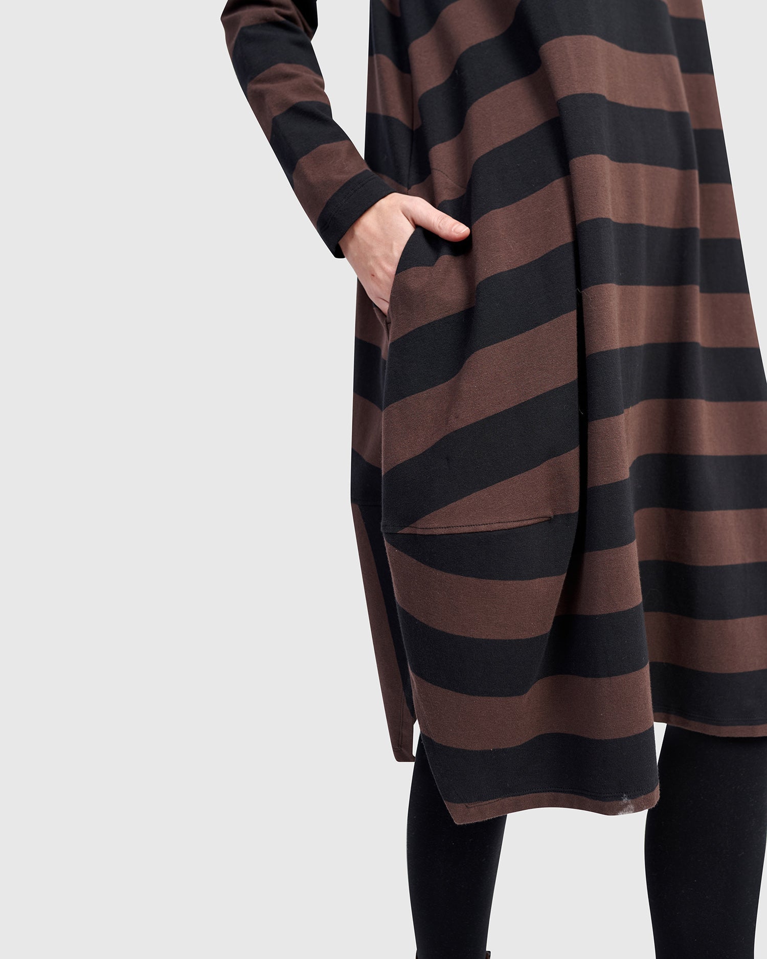 Soft structure meets laid-back polish in this cocoon-shaped dress. A fitted shoulder balances the voluminous A-line silhouette, with a gently tapered hem and generous skirting. The stretch cotton jersey offers substantial drape with breathable ease, while sporty side slits and discreet pockets add everyday function. Finished with a wide scoop neck, this modern midi flatters with minimal effort.