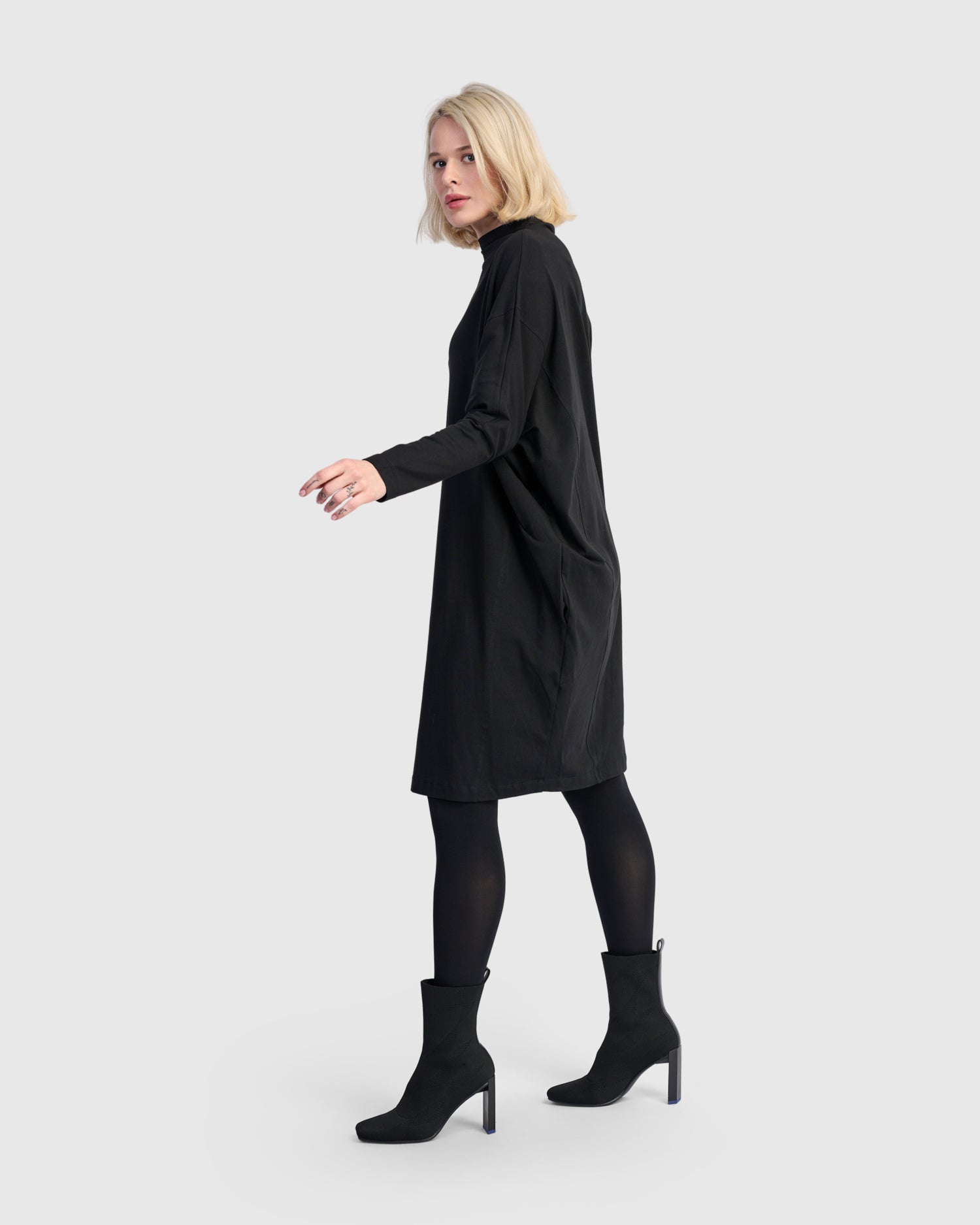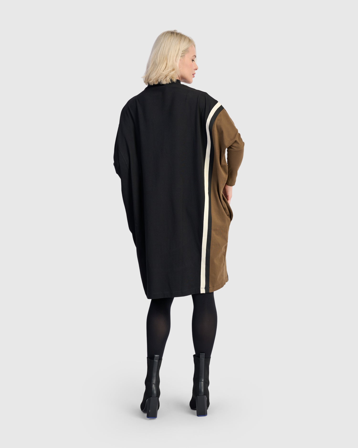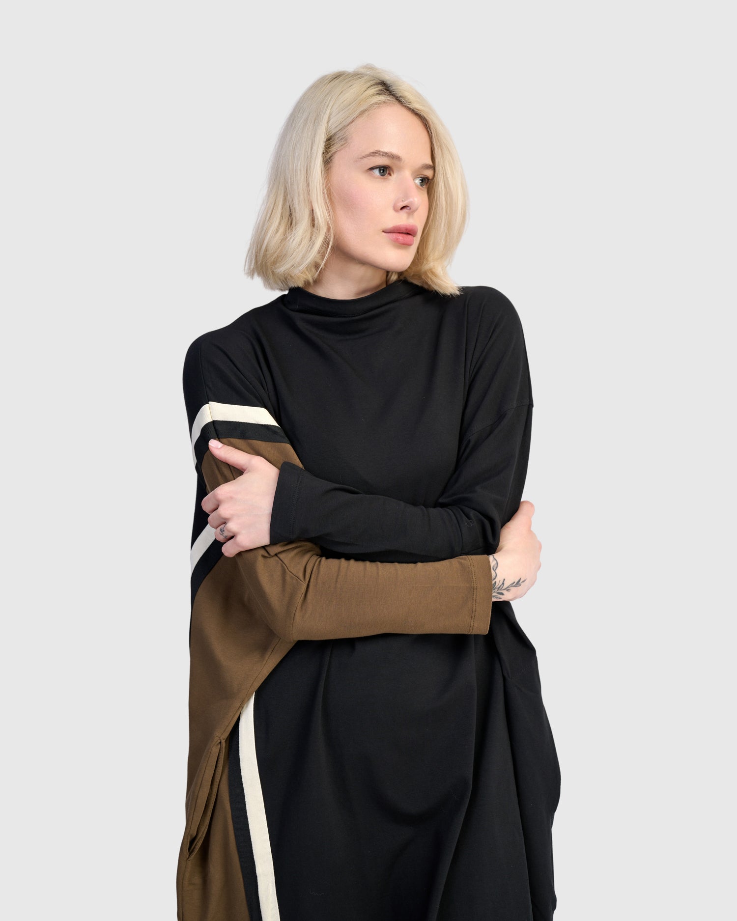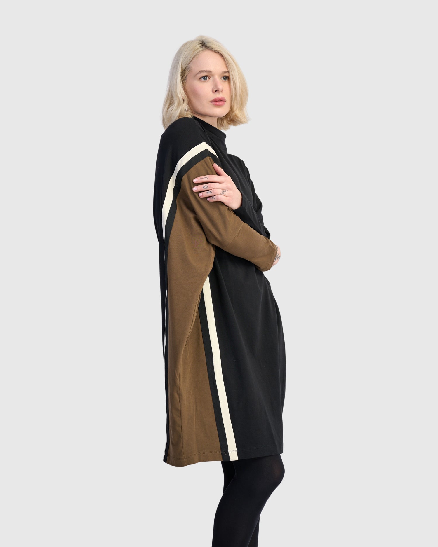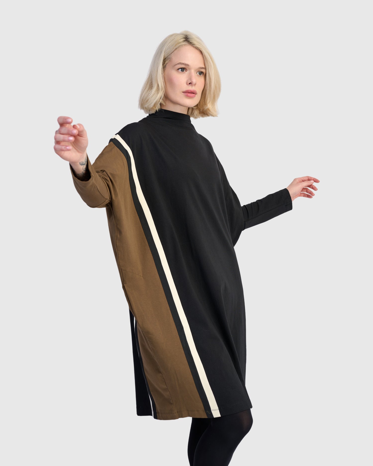 This energetic tee dress fuses sport and style with bold colorblocking and a tapered silhouette. The funnel neck and dolman sleeves add a sculptural edge, while the soft jersey fabric keeps it grounded in all-day comfort.