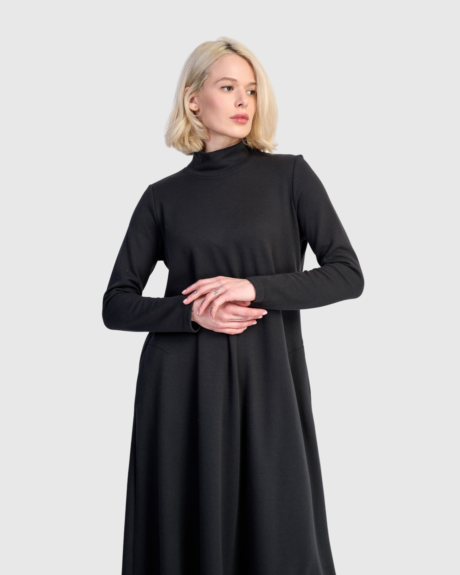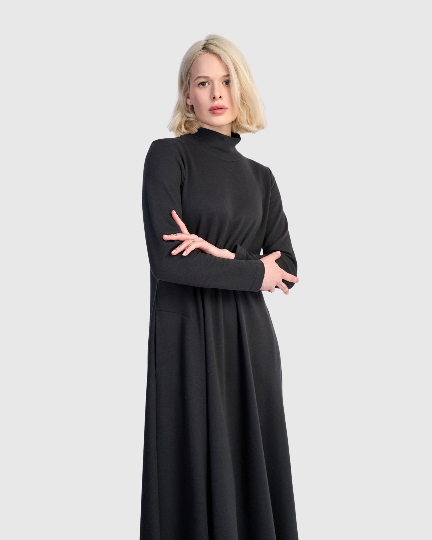 A streamlined A-line silhouette with gentle tapering through the bust gives this maxi dress a clean, flattering shape. Crafted from plush cotton-blend terry with a soft brushed interior, it offers midweight warmth without bulk. The mock neck and long sleeves provide seasonal coverage, while side-seam pockets add function to its polished profile. A core piece in your casual-chic rotation.